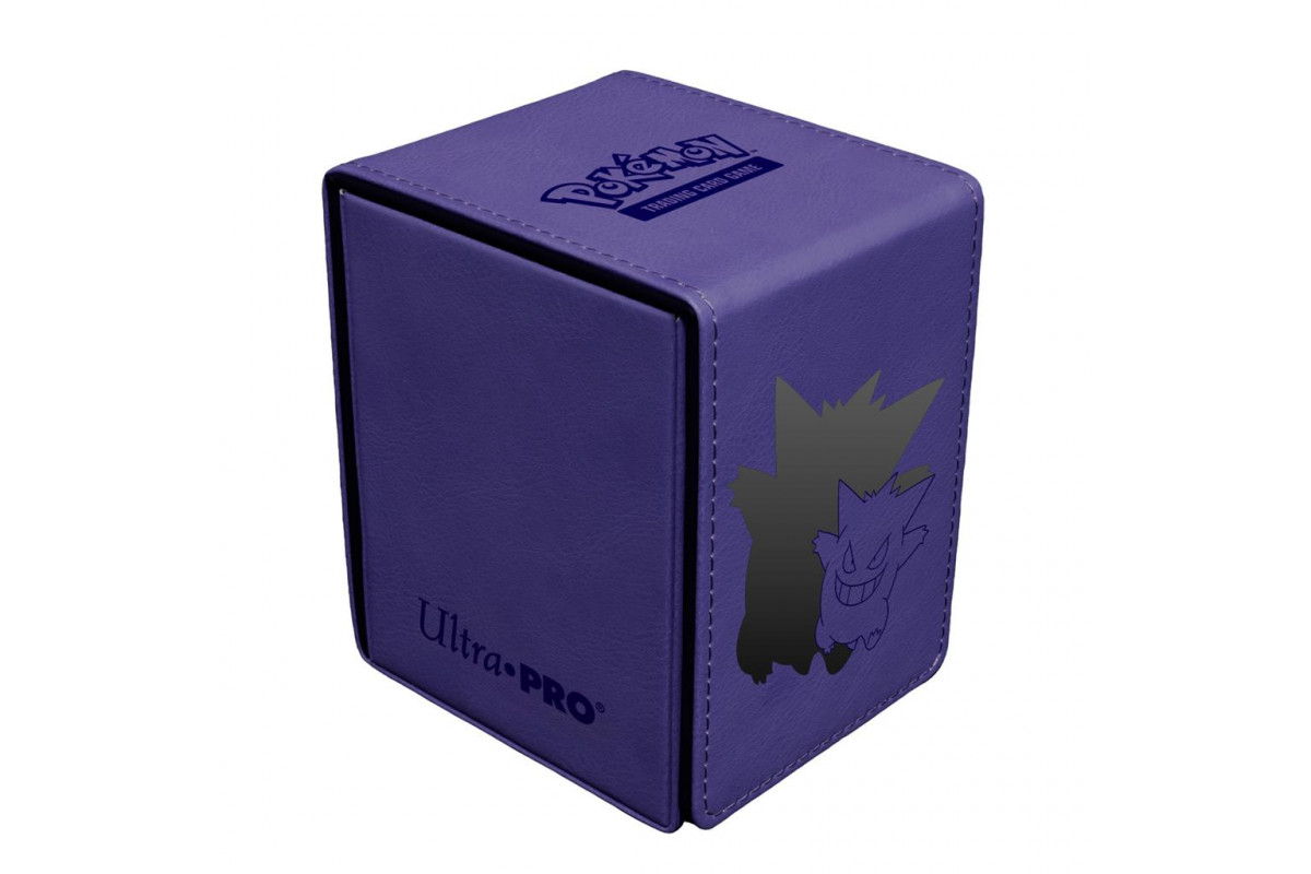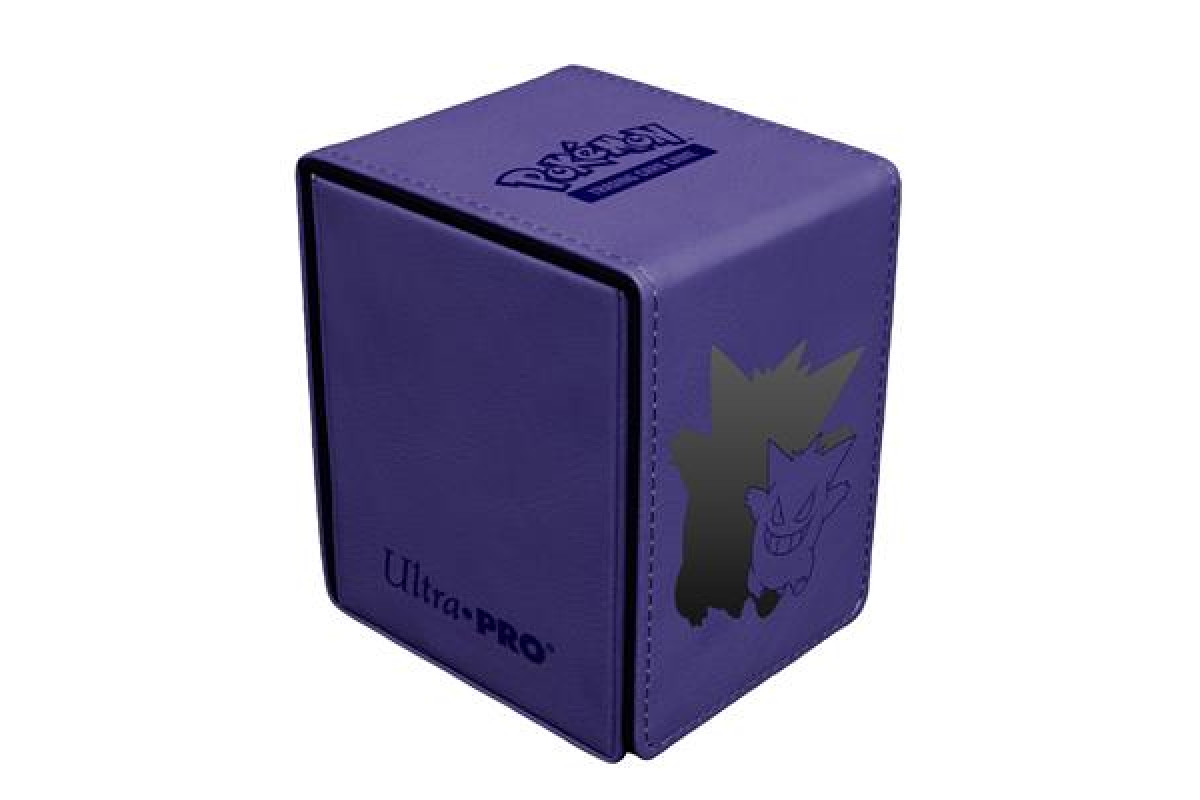 The Alcove Flip Box for Pokémon features a debossed image of Gengar on a leatherette finish with premium foil detailing. A strong magnetic closure keeps your cards safely secured inside, and dual thumb notches offer easy access to your deck. This Deck Box® holds up to 100+ standard size trading cards double-sleeved in Ultra PRO Deck Protector® sleeves. The lid can be detached from either side of the box to accommodate any play style.