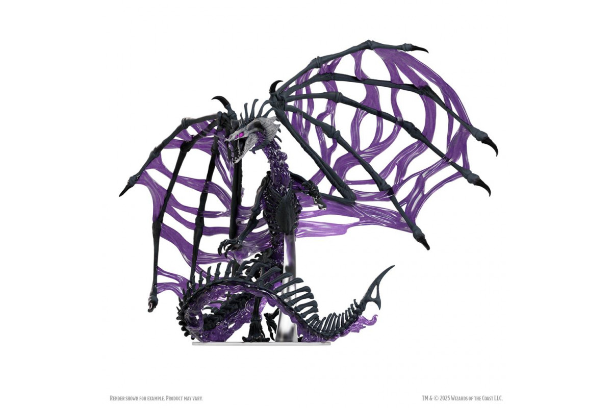 The D&D Icons of the Realms: Black Dracolich Boxed Miniature is a Gargantuan-sized prepainted Dungeons & Dragons miniature on a 100mm clear plastic base. Utilizing haunting purple translucent materials and standing 10 inches tall, this undead dragon mini makes for a great campaign antagonist or frightening addition to your collection.