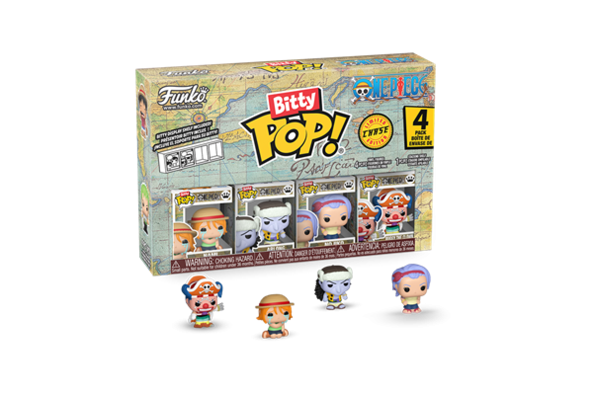 The world of POP! is getting bigger—and smaller—with Bitty POP! collectibles! Expand your One Piece collection with this 4-pack featuring Bitty POP! Nami, Bitty POP! Arlong, Bitty POP! Nojiko, and a chase Bitty POP! figure. The possible chase Bitty POP! collectibles are Hyper Rare (1/6) Shanks, Hyper Rare (1/6) Buggy the Clown, Rare (1/3) Smoker, and Rare (1/3) Dracule Mihawk.