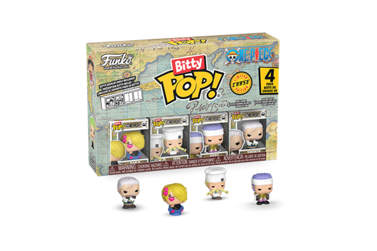 The world of POP! is getting bigger—and smaller—with Bitty POP! collectibles! Expand your One Piece collection with this 4-pack featuring Bitty POP! Sanji, Bitty POP! Zeff, Bitty POP! Krieg, and a chase Bitty POP! figure. The possible chase Bitty POP! collectibles are Hyper Rare (1/6) Shanks, Hyper Rare (1/6) Buggy the Clown, Rare (1/3) Smoker, and Rare (1/3) Dracule Mihawk.