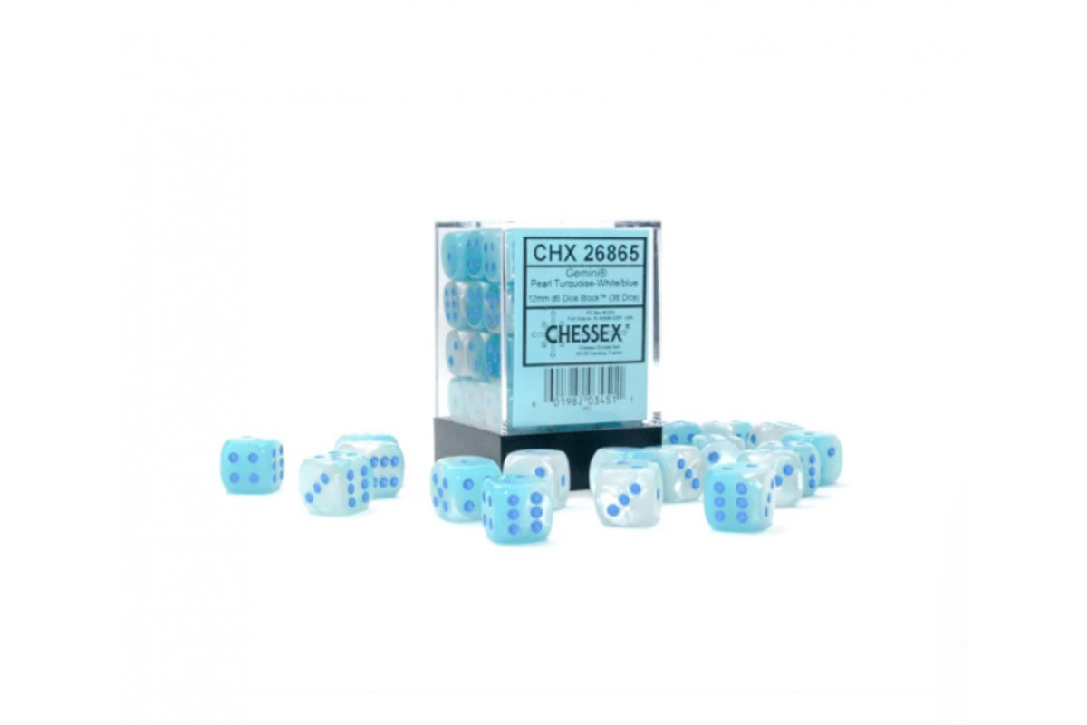 Chessex 12mm d6 with pips Dice Blocks (36 Dice) - Pearl Turquoise-White/Blue