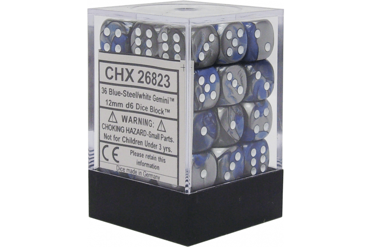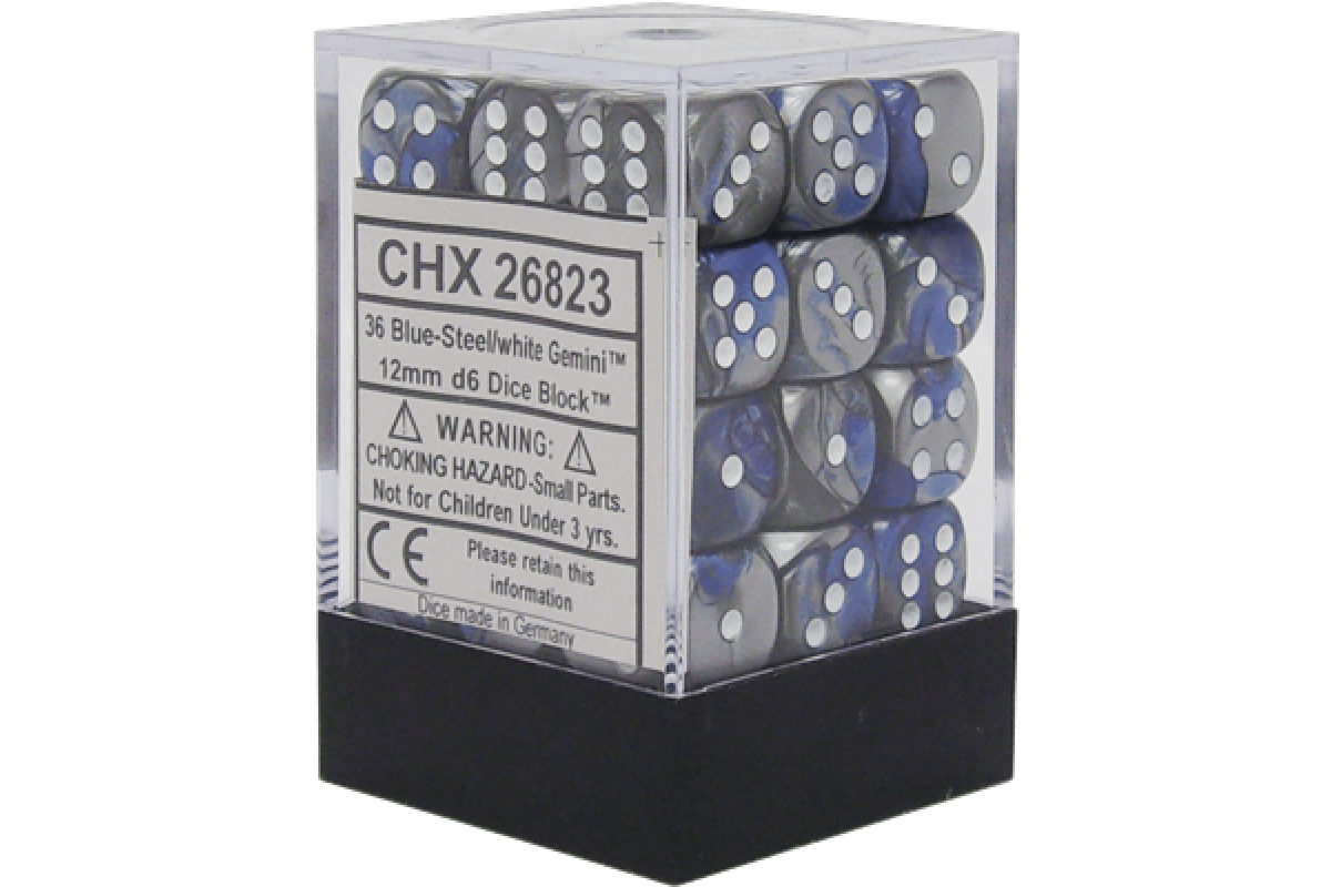 Chessex Gemini 12mm d6 Dice Blocks with pips Dice Blocks (36 Dice) - Blue-Steel w/white
