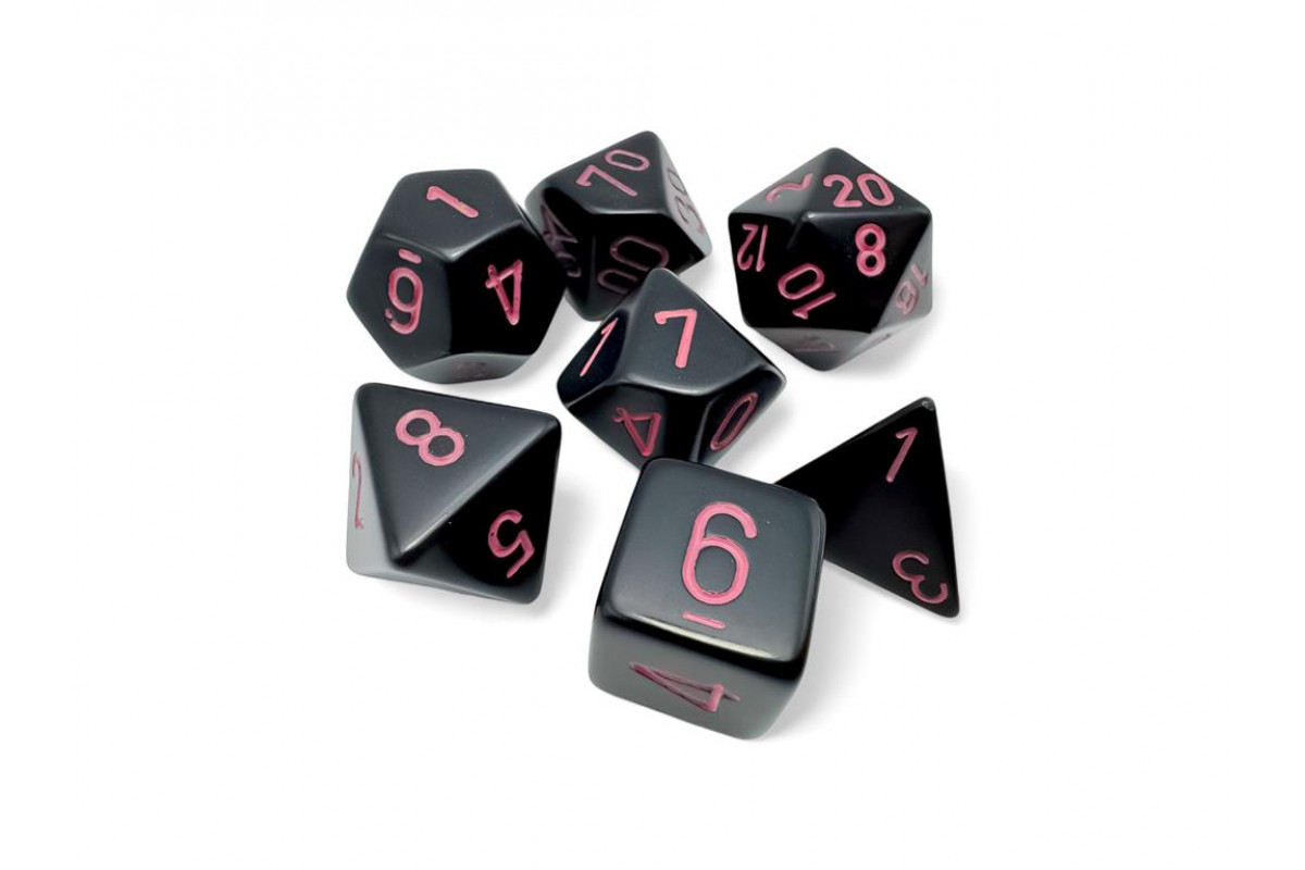 This set contains 7 Opaque Black dice with pink numbers with the following shapes: