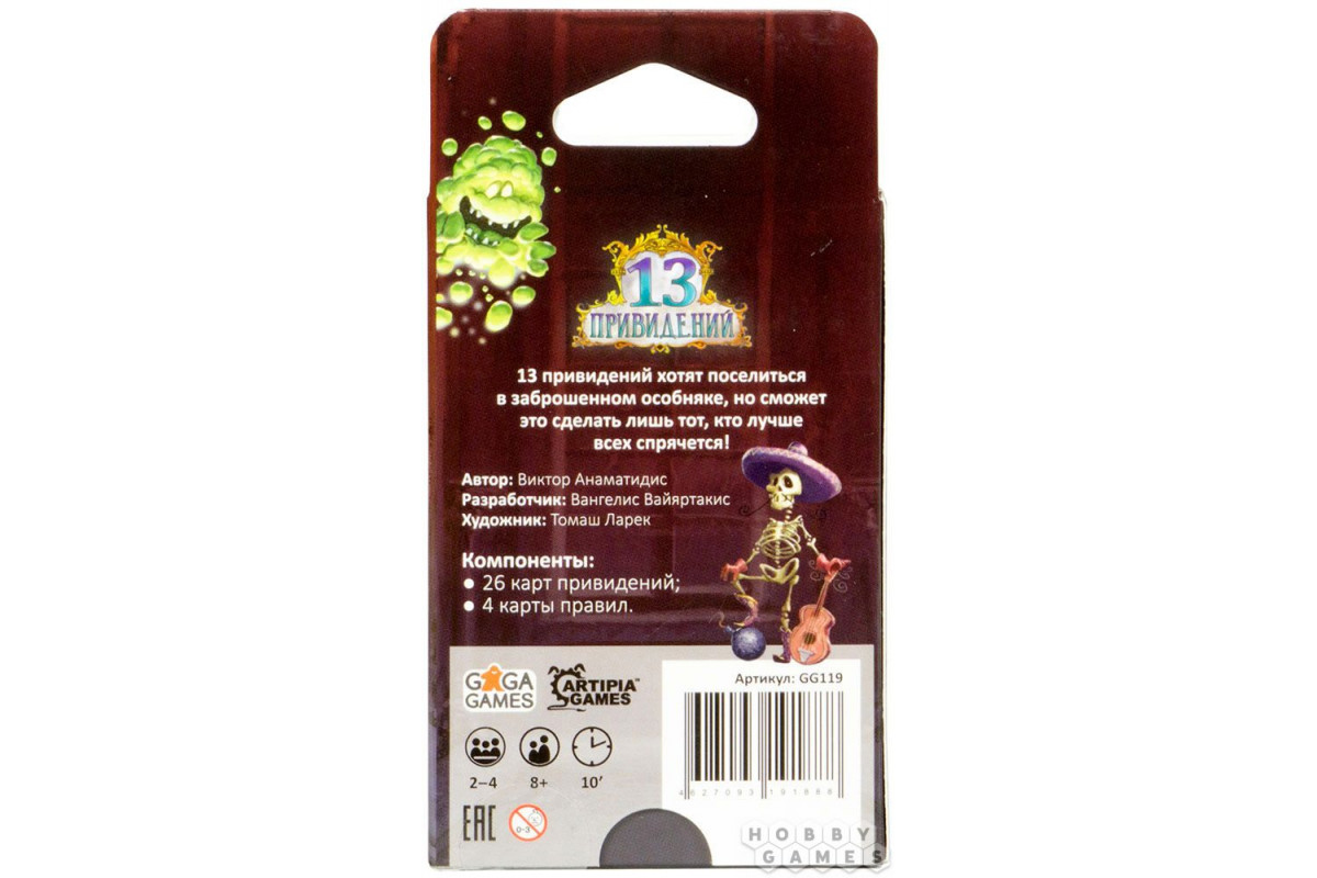 "13 привидений" — быстрая весёлая игра про беспокойных духов. Задача игроков — помочь призракам обрести покой в заброшенном доме, но для этого духов придётся хорошенько спрятать.