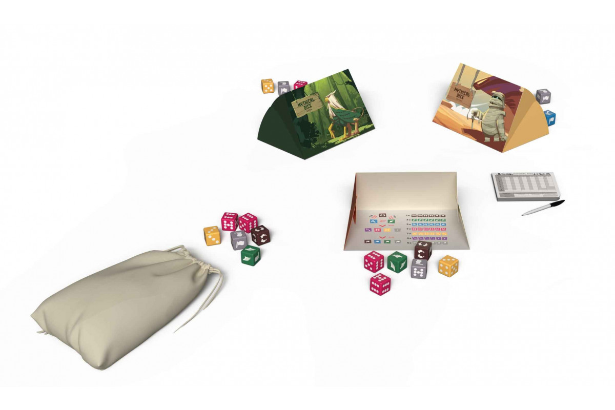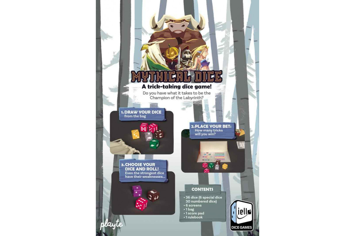Mythical Dice is a trick-taking game played with dice. Guess how many tricks you will take (or not) at the start of each round. Guess right, and you will become the champion of the labyrinth! Each round, you’ll play with an extra die to score more points or risk losing everything.Be careful, your dice may be captured or even worth zero! It’s up to you to come up with the best strategy based on your roll statistics! Because in the end, in Mythical Dice, it’s the values that count (and the fun around the table when your precious Minotaur finally falls on its zero face, causing you to lose your precious bet!