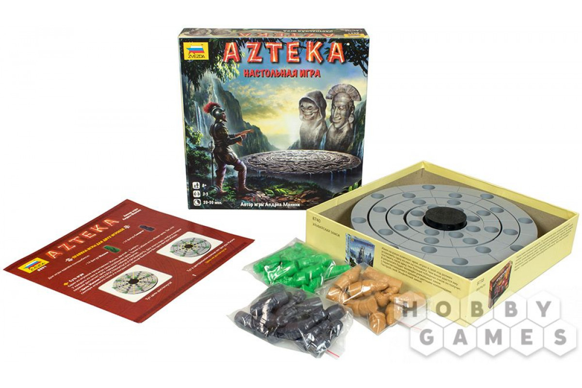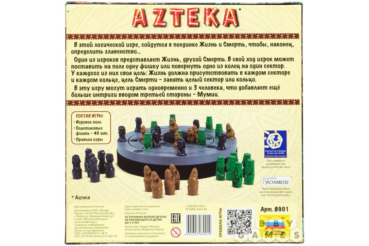 В настольной логической игре "Ацтека" игроки выставляют на поле фигурки. Один тип фигурок символизирует Жизнь, другой – Смерть. Четыре кольца игрового поля можно вращать в разные стороны в зависимости от Вашего хода. Каждому игроку для достижения победы необходимо выполнить определённую цель. Игрок, выбравший фигурки Жизни, должен расположить их таким образом, чтобы в каждом кольце и в каждом секторе поля была фигурка. А оппонент, которому достались фигурки Смерти, должен помешать планам соперника и полностью заполнить своими фигурами один сектор или одно кольцо.