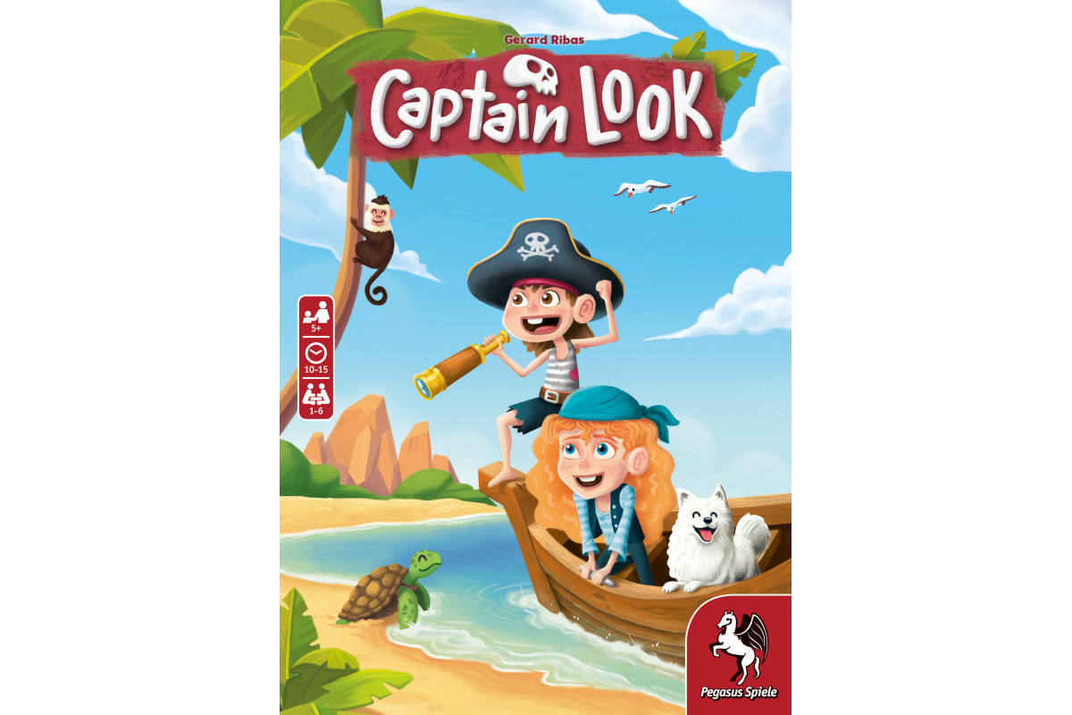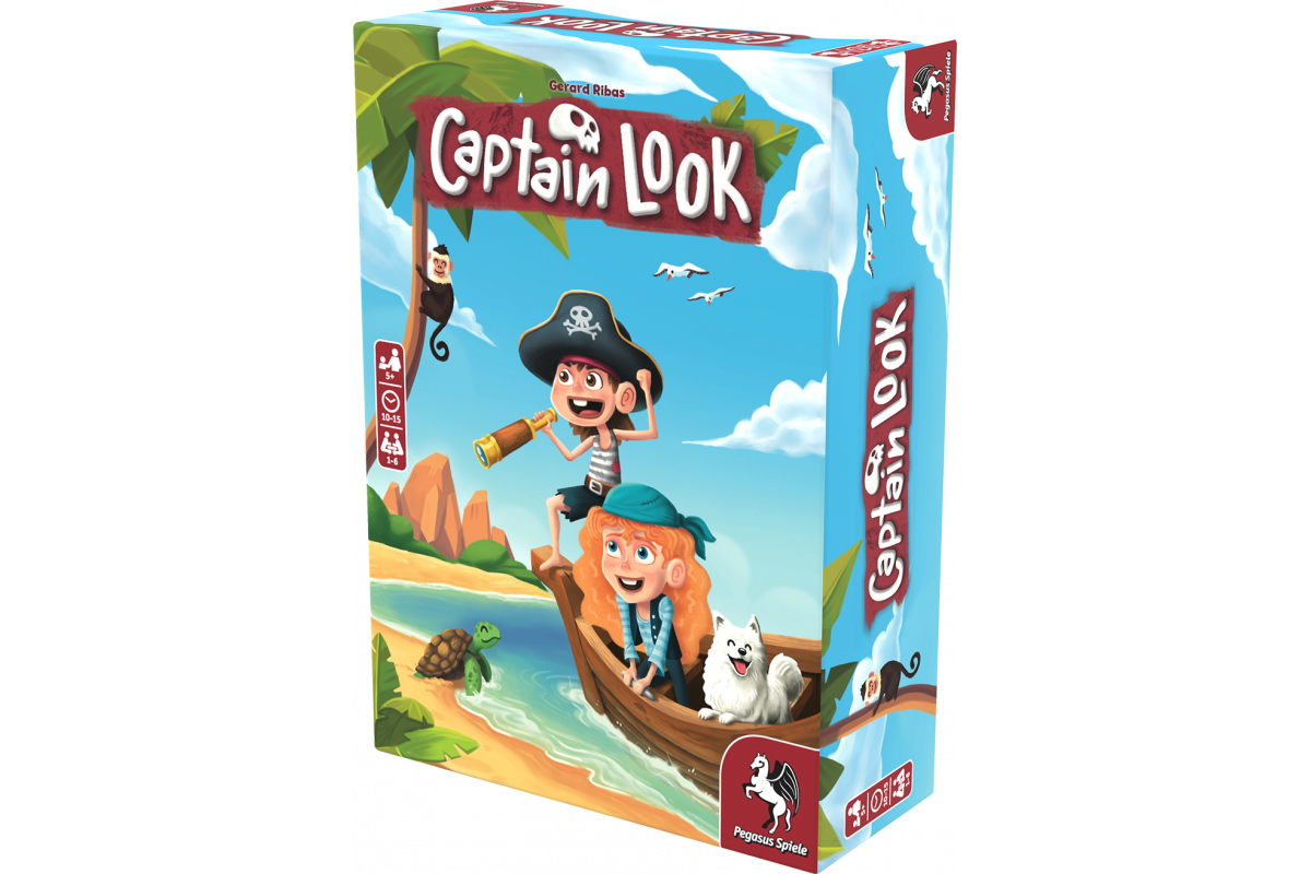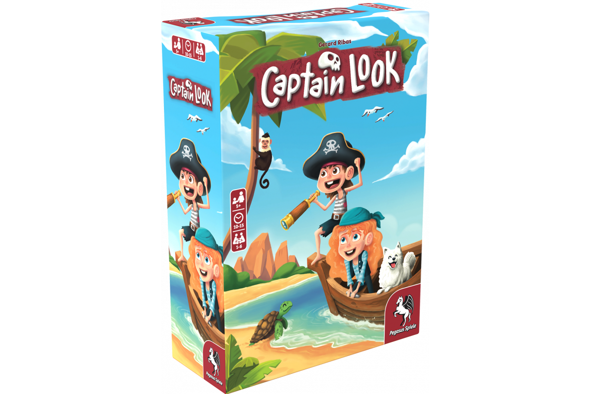 In the cooperative memory game Captain Look for little treasure hunters, a treasure island card is revealed at the start of the game, which all players must memorize in approximately 10 seconds. The players will next take turns looking through a telescope at a random tile that displays one of several visual motifs. If the group decides that the motif visible in the telescope was present on their original treasure island card, their boat moves forward. But be careful: if you ever catch sight of a pirate flag, pirates will attack. Once the group finally reaches the island, they will check the original treasure island card to discover whether they successfully navigated to their intended destination.