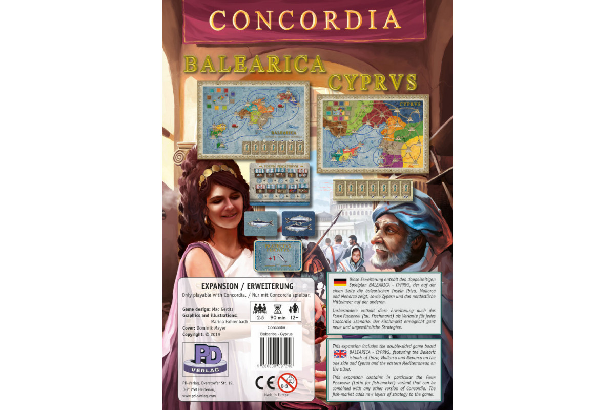 Die Balearen sind der erste Spielplan mit mehreren Inseln, zudem ist in Concordia: Balearica - Cyprus Zypern enthalten. Der Fischmarkt mit seinem strategischen Potential kann auch mit allen anderen Plänen und Erweiterungen kombiniert werden. Erweiterung für das Grundspiel Concordia.