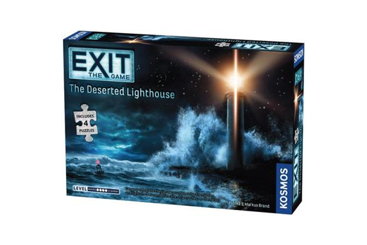 Can you complete the jigsaw puzzles, solve the riddles, and light the beacon before the ship crashes on the rocks?  You trudge along the dark, rocky coast seeking shelter from the raging storm. Drenched to the bone, you look up to see a brilliant beam of light pierce the curtains of rain. A lighthouse! But suddenly and inexplicably, the light goes out. You glance out into the water and spot a ship. It is heading straight for the cliffs! You realize that it is up to you to race to the top of the lighthouse and turn it on again before the ship crashes on the cliffs! But many puzzling obstacles stand in your way.  In this EXIT game, there are riddles within riddles, hidden within four jigsaw puzzles. Like other EXIT titles, The Deserted Lighthouse has no game board, but it also has no riddle cards. Instead, there are four jigsaw puzzles that you will find and assemble, one at a time. Each completed puzzle reveals a location containing more riddles to decipher.   At the start of the game, all you have available to you is a decoder disk and the first set of puzzle pieces. Over the course of the game, you will find strange items that must be used to solve the riddles in the puzzles. The game ends when you have solved the last riddle and relighted the lighthouse’s beacon, saving the ship from sinking.   Difficulty level: 4 of 5