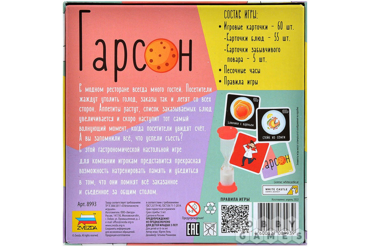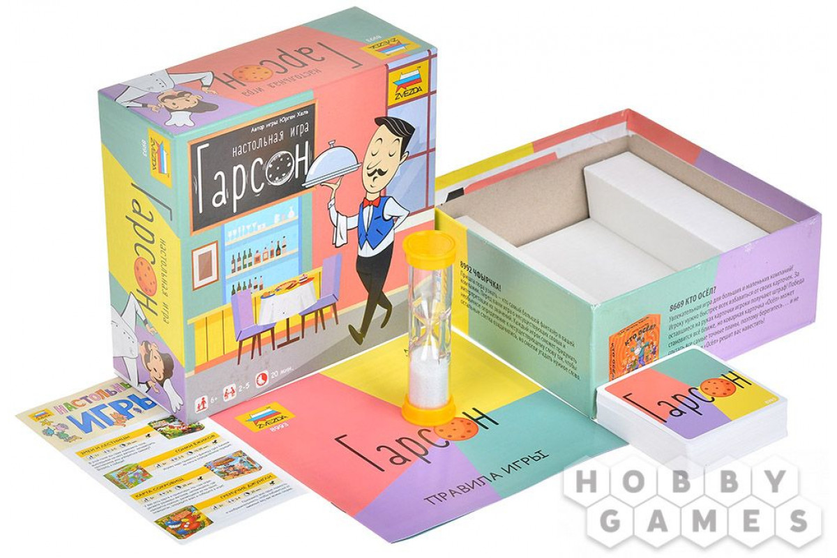 "Гарсон" – это компактная, динамичная и весёлая настолка для детей и их родителей, где проверяется внимание и память. Простые правила, азарт и общение делают игру отличным выбором для семейного вечера. А ещё благодаря компактности её можно взять в дорогу – и соревноваться с друзьями в крепкости своей памяти где угодно!