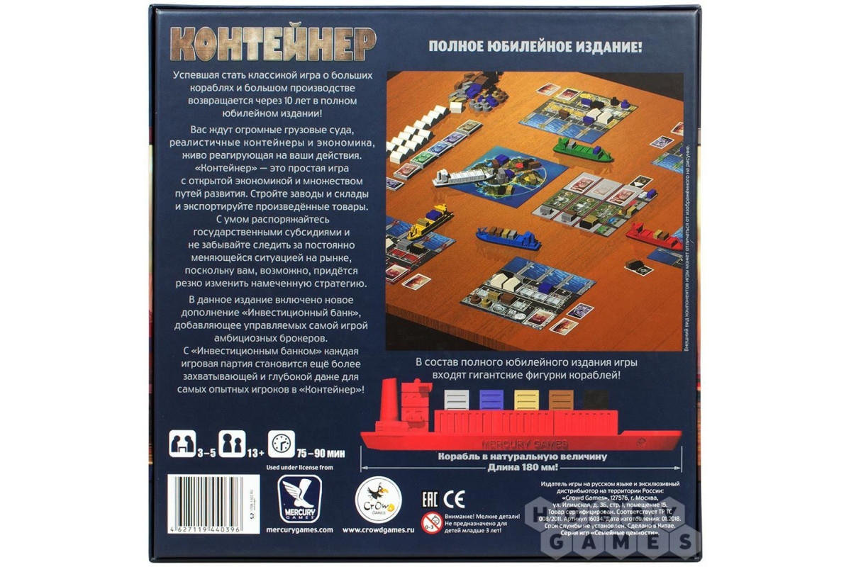 "Контейнер" – это глубокая экономическая игра о больших кораблях и большом производстве. Каждый игрок станет как производителем товаров, так и грузоотпправителем. Возьмите на себя руководство огромным контейнерным терминалом и не менее огромными контейнеровозами. Стоит заметить, что миниатюры кораблей по-настоящему большие, по восемнадцать сантиметров в длину.