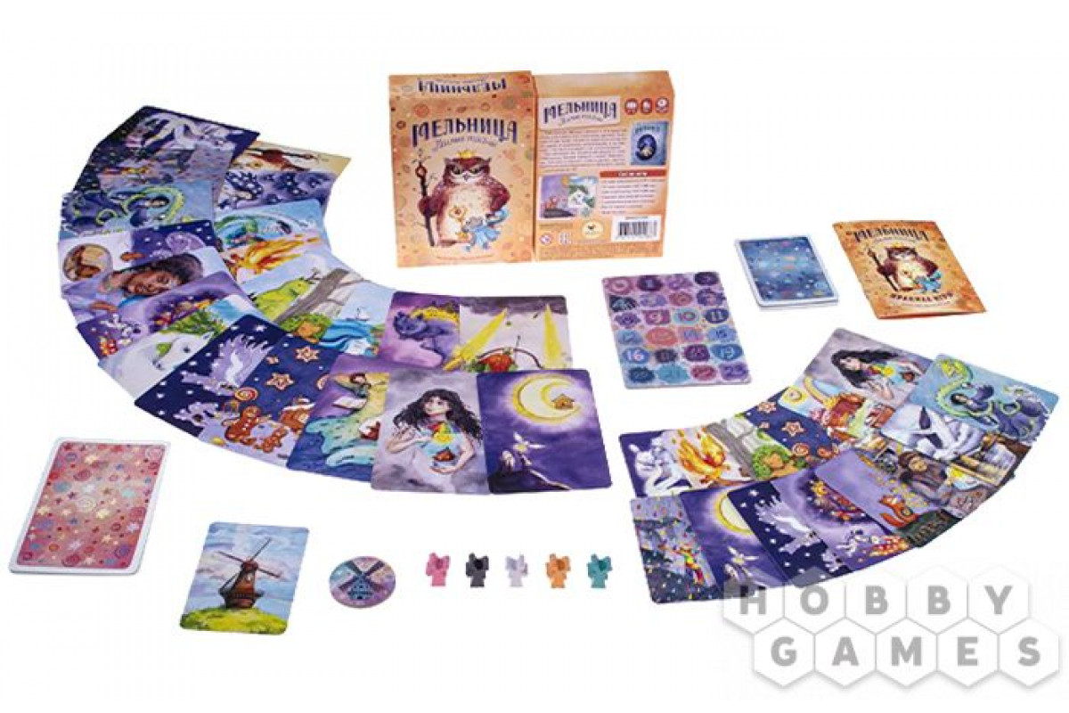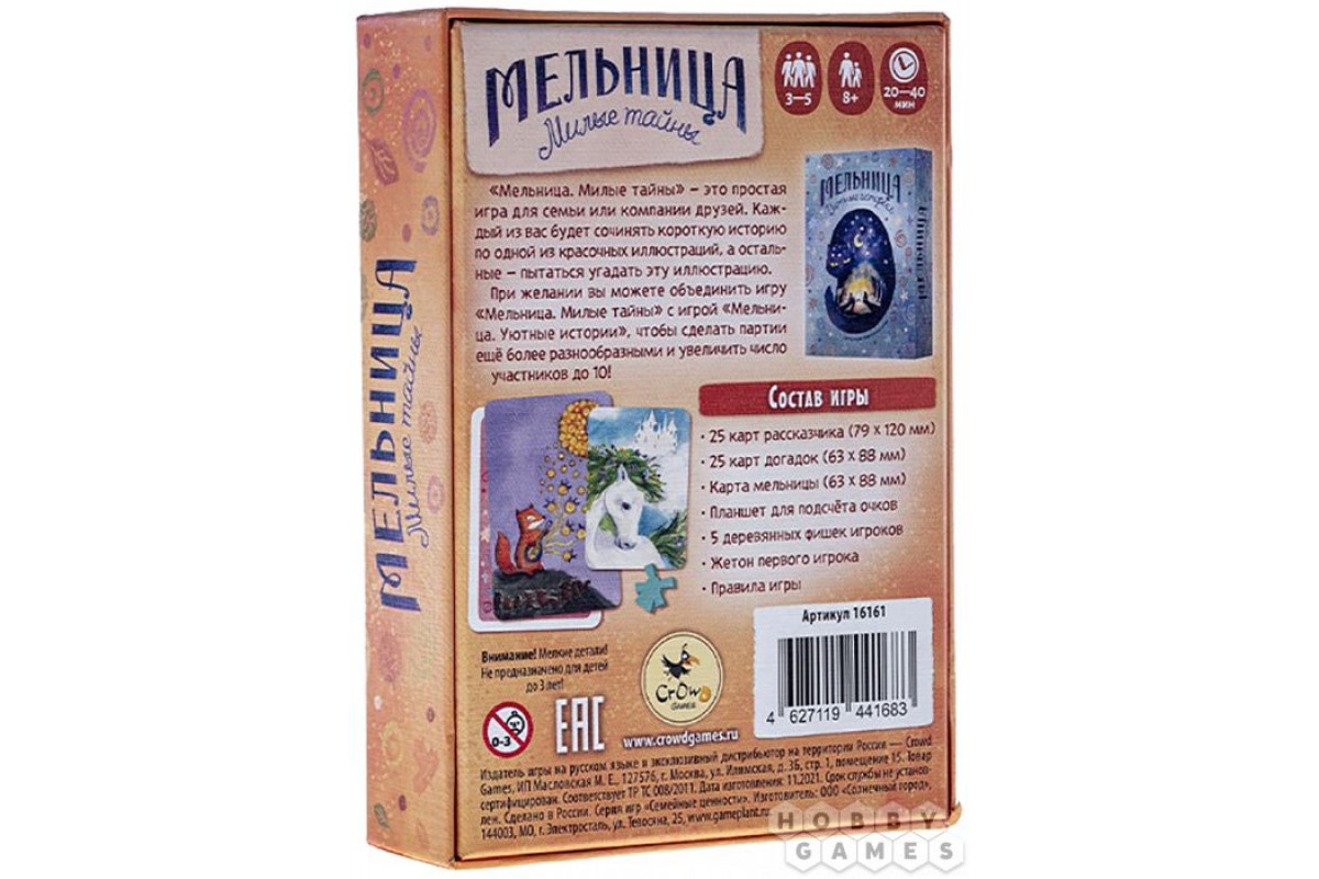 В настольной игре "Мельница: Милые тайны" именно этот талант вам и пригодится! Не сдерживайте буйство своей фантазии, ведь вам будет нужен её полный полёт! В этой увлекательной семейной игре на ассоциации каждый из игроков становится рассказчиком, который будет придумывать историю по одной иллюстрации. В игре есть 25 больших карт – карты рассказчика, и 25 карт поменьше, которые полностью повторяют большие – это карты подсказок. Последние выкладываются в центр стола сеткой 5x5 карт, а большие карты перемешиваются и кладутся стопкой рядом с полем. Ведущий берёт верхнюю карту рассказчика из колоды, изучает её, и сочиняет короткую историю по иллюстрации на ней. Остальные игроки, послушав историю, должны угадать, на какую карту загадана история – тут им и помогают карты подсказок на столе. Важно придумать историю, которую отгадают, но не сразу: чем позднее игрок даст правильный ответ, тем больше победных очков вы заработаете как рассказчик!