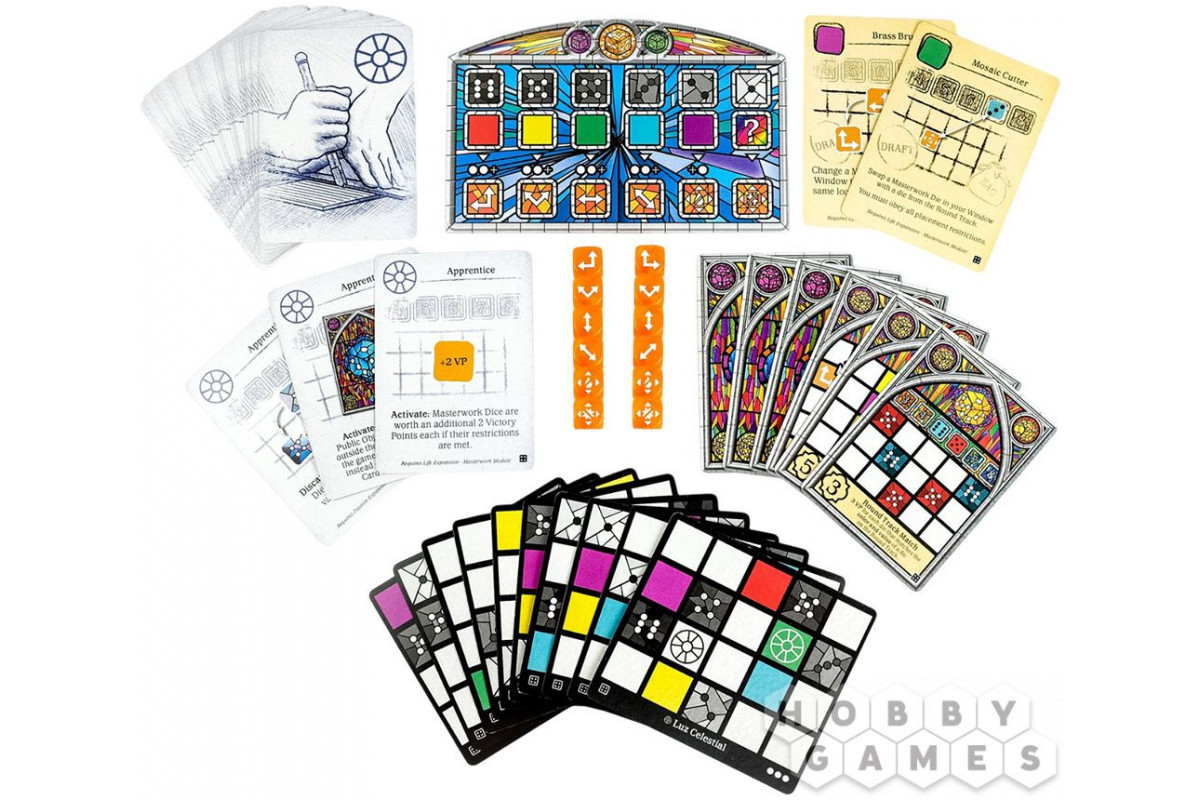 Первый модуль приносит новые витражи и карты подмастерьев. На витражах появились особые символы: за них можно получить карту подмастерья. Эти карты дают полезные бонусы – некоторые сразу, а другие срабатывают в конце партии, открывая новые пути к победе. Во втором модуле в игру входят кубики мастерства. Их цвет – оранжевый, а яркость равна нулю, поэтому они не участвуют в обычных комбинациях. Зато каждая грань такого кубика предлагает условие для получения очков. Если вам удастся его выполнить, вы получите +5 очков, а если нет – увы, потеряете 2. Третий модуль предлагает новые цели – более сложные и требовательные. Они проверят, насколько мастерски вы научились выкладывать витражи и готовы ли вы принять настоящий вызов.