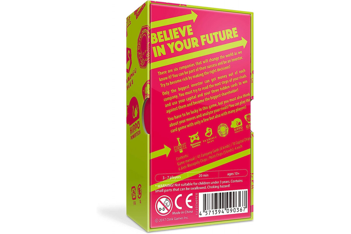 Every player takes the role of an investor and needs to try to invest in at least one of six startup companies to get the biggest shares. Only the player with the most cards of one company can get money in the end, which is why you need to carefully watch the moves of your rival players and thus become the top investor. Although the game has a short playtime like our other games, it has a more extensive game play than the others. To make the original game even more interesting, Oink Games added "the market", the "Anti-Monopoly-Chip" and more. The rules are still as simple as they were, but if you have played Rights before you should notice a new depth to it.