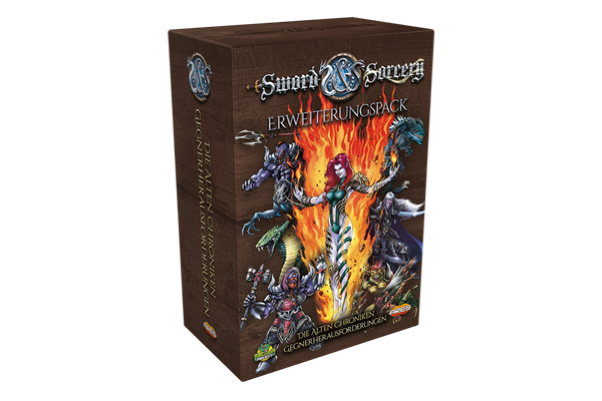Die Erweiterung Gegnerherausforderungen beinhaltet Varianten aller Basis-Gegner aus dem Grundspiel Sword & Sorcery: Die Alten Chroniken und bietet 16 neue Wesen mit eigenen Gegnerfiguren, Gegner-Pergamenten und Gegnerkarten.