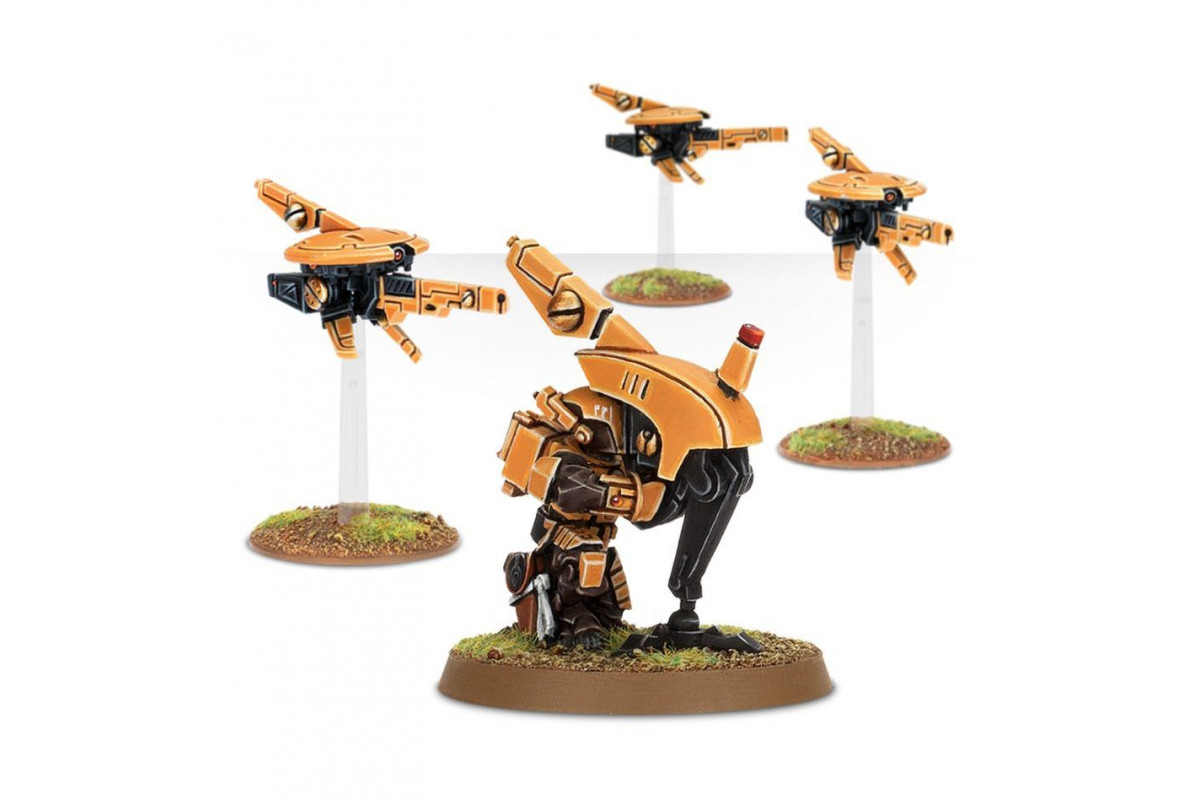 T'au Sniper Drone Teams are the ultimate anti-infantry weapon in the T'au arsenal. Each drone is equipped with a Rail Rifle that can fire a high velocity projectile at such extraordinary speed that it will punch clean through the armour of almost any adversary. The resultant mess is enough encouragement for most enemies to dive for cover, cowering in fear that they may be singled out as the next target.