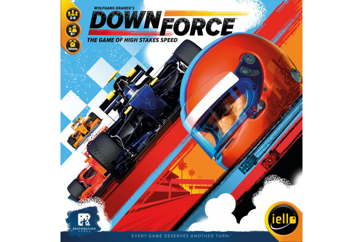 High-stakes bidding on million-dollar race cars. Frantic bets placed in secret even as the cars race around the track. And to the victor, the biggest purse of all. But in the world of motor racing, the margin between victory and defeat can be a single moment: a steep banked turn, tires screaming and spitting out smoke, and the downforce, pressing you down in your seat and keeping you on the track as you make your move inside to pull ahead. Downforce is a card-driven bidding, racing, and betting game for 2-6 players based on Top Race, the award-winning design by the legendary Wolfgang Kramer. Players first bid to own the six cars in the race, then they play cards from their hand to speed them around the track. However, most cards will also move their opponents' cars. So figuring out just the right time to play a card is the key to victory. Along the way, players make secret bets on who they think will win the race. Whoever has the most money from their prize money, winning bets, and remaining bank wins. This is a game whose design needed no attention. Years of play and multiple versions have honed it to near perfection. On the contrary, one of the design challenges was figuring which of the many rules modules to incorporate to create the most fun version. Downforce also adds variable player powers to improve replayability. But mostly, it improves the look of the game to make it gorgeous and easy to play. Special attention was paid to the colors, the layout of the cards, the design of the cars, the details on the board, and more.