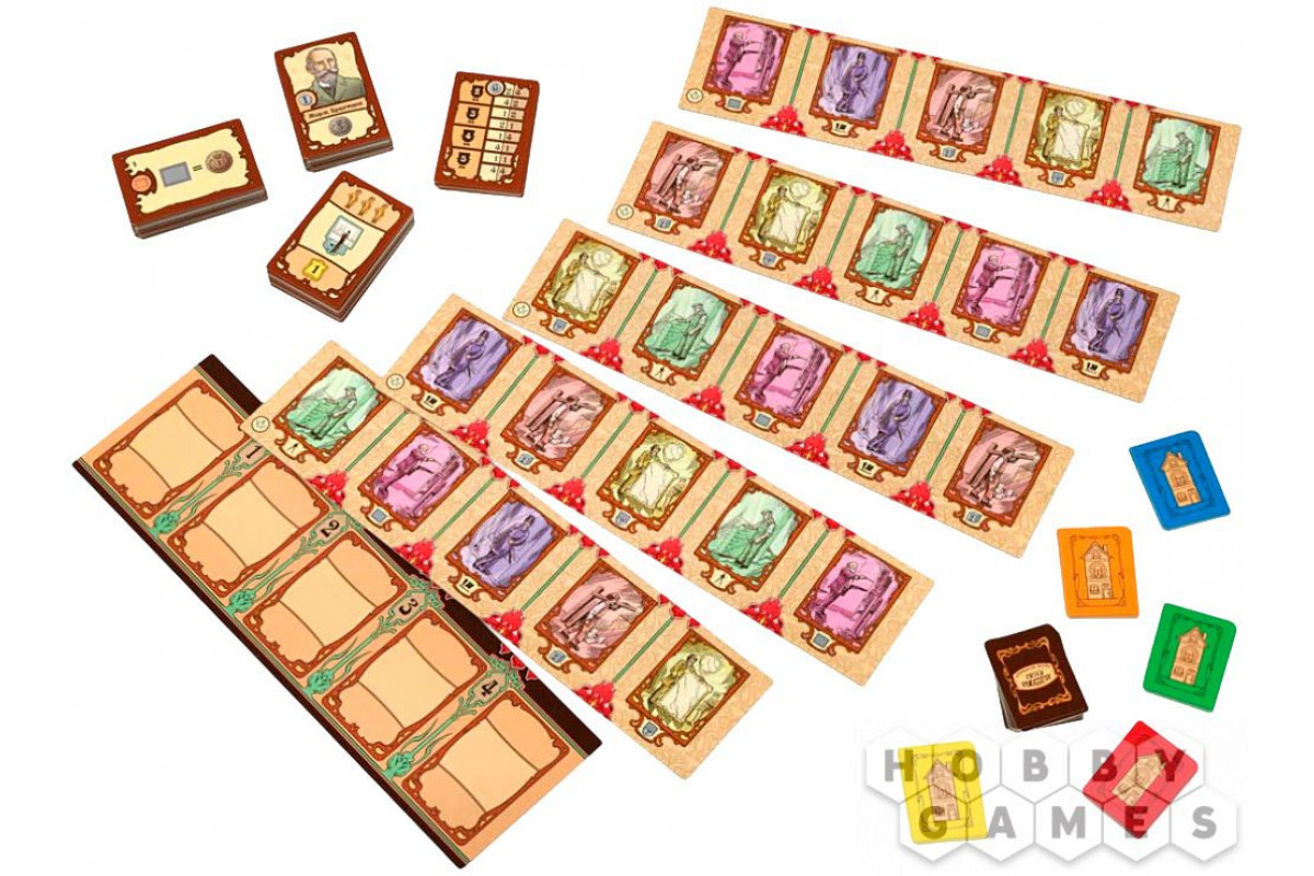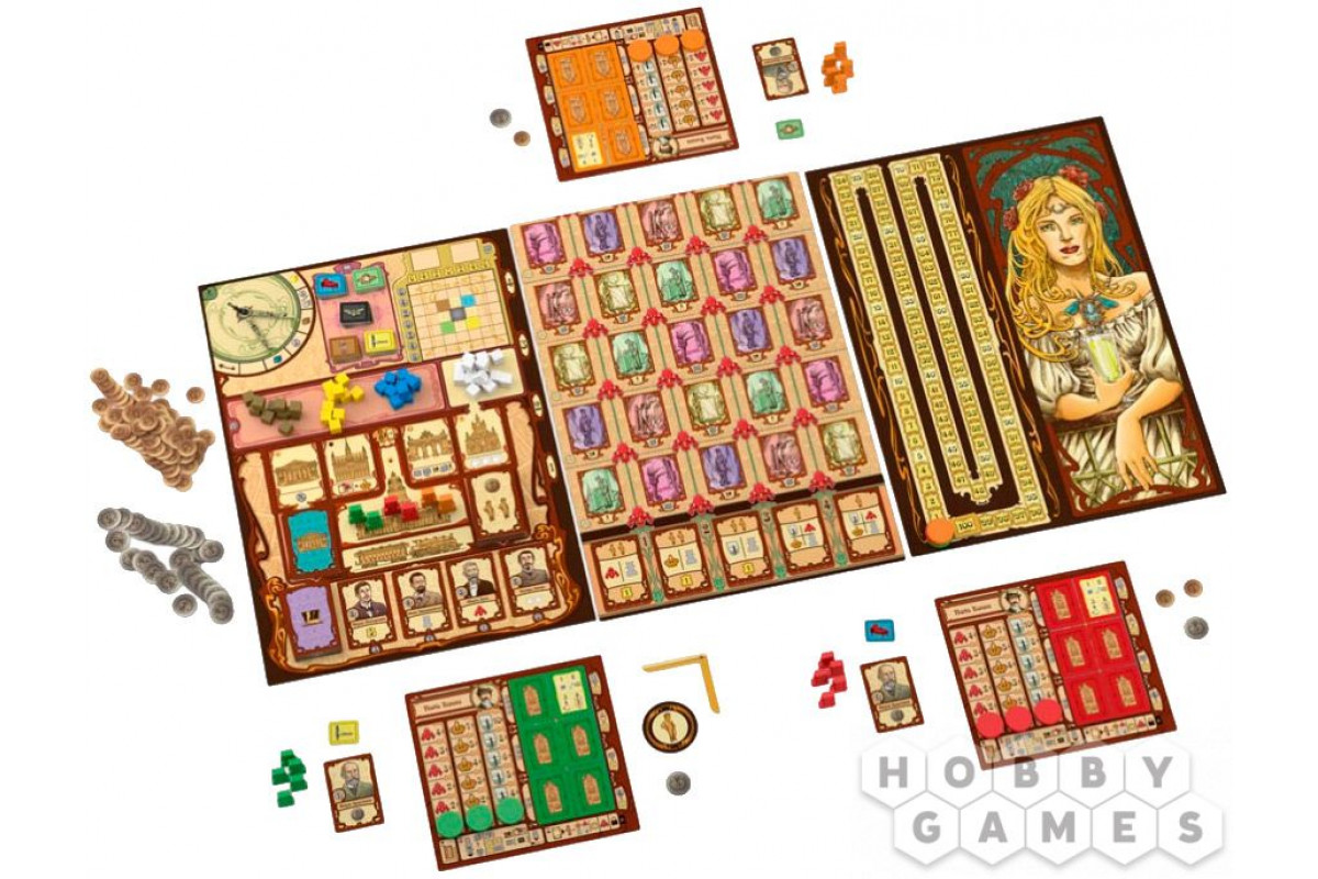 В коробке вы найдёте две части: базовую версию и дополнение "Прекрасная эпоха", которое вводит новые механики, карточки меценатов и уникальный ресурс – стекло, позволяющий строить павильоны. Игра подойдёт для опытных игроков, которые любят сложные стратегии, управление ресурсами и элементы аукциона.