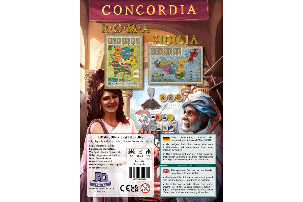 Diese Erweiterung enthält den doppelseitigen Spielplan ROMA - SICILIA. In der Ewigen Stadt Rom bietet eine neue Schifffahrtsleiste mit interessanten Boni ganz neue taktische Elemente. Im Osten Siziliens bestimmt der Vulkan Ätna das antike Leben und wirkt sich auf die Produktion und Bautätigkeit in den umliegenden Provinzen aus.