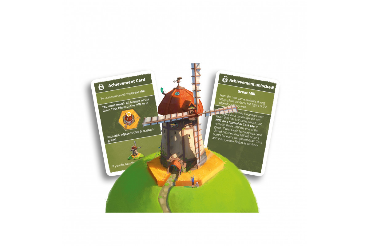 The Great Mill is a mini-expansion for Dorfromantik - The Board Game and contains two cards as well as a mill standee. After completing the mill task, the achievement is unlocked, with which extra points for grain tasks and yellow flags can be collected by cleverly placing the mill figure.
