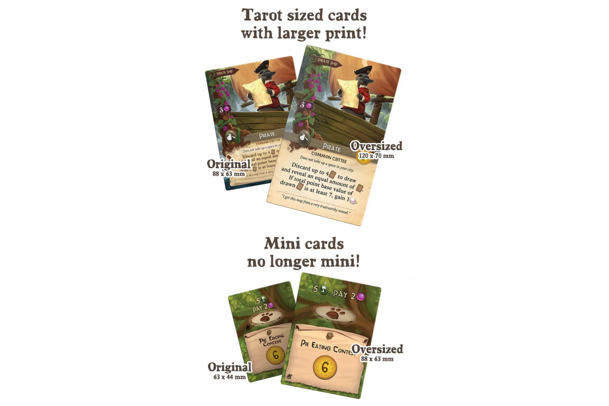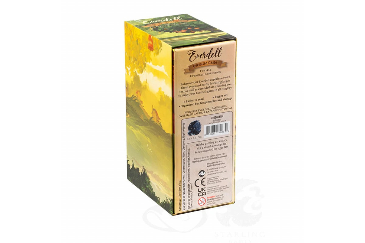 Enhance your Everdell experience with these oversized cards, featuring larger text as well as extended art allowing you to enjoy your Everdell game in all its glory. Easier to read Bigger art Organized box for gameplay and storage REQUIRES EVERDELL BASE GAME, OVERSIZED CARDS, & EXPANSIONS TO PLAY