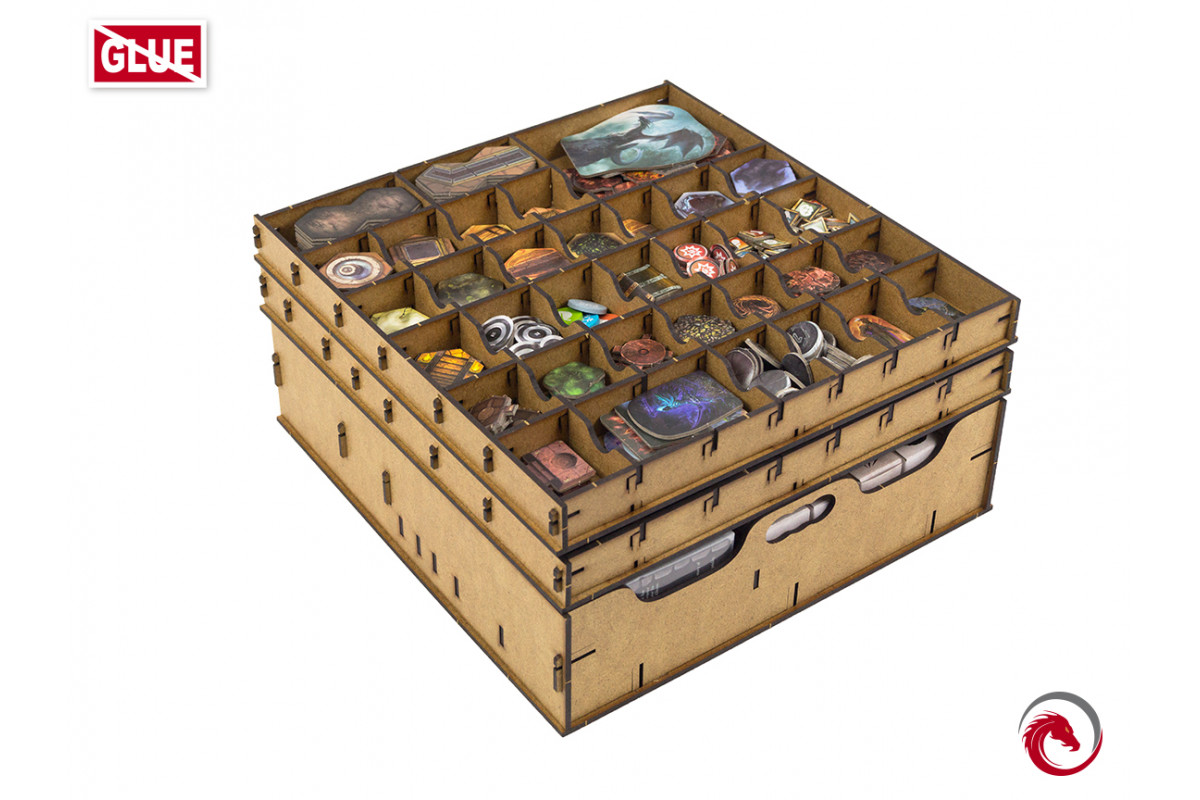 e-Raptor Insert compatible with Gloomhaven is a perfect accessory designed to organize and improve gameplay of the board game. Thanks to this insert you can arrange all game components and keep them in order no more mess on the table while playing. No more looking for necessary elements during the game. You can hold all your player boards, miniatures, tokens, sleeved cards, dials, boxes, map tiles etc. in one place without being afraid of losing control of the setting. They can be easily accessed and do not take as much space as during the game without an insert. Also, when the box is closed, the components are still kept in order, ready for setting another game quicker than ever before. The insert is composed of three large and accessible trays. All of them can be taken out of the board game box which makes sorting and reaching all components very easy. You can see the suggested components setup on the pictures. The insert is durable and made of high quality HDF. To assemble it, there is no glue required. It allows to hold all components inside the box, including board, scenario book, map tiles and manual.