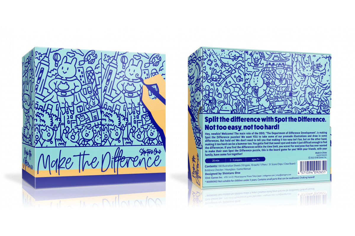 Hey, newbie! Welcome! The main role of the DDD, "The Department of Difference Development", is making Spot the Difference puzzles! We want YOU to take some of our premade illustrations and draw in some differences. But hold on! We don't need to tell you that making it too easy isn't fun, but on the other hand making it too hard can be a bummer too. You gotta find that sweet spot and make it just difficult enough to find the differences. If you find the differences within the time limit, you score! For everyone that has ever wanted to make their own Spot the Difference puzzle, this is the board game for you! With your freind, with your family, have some fun together!