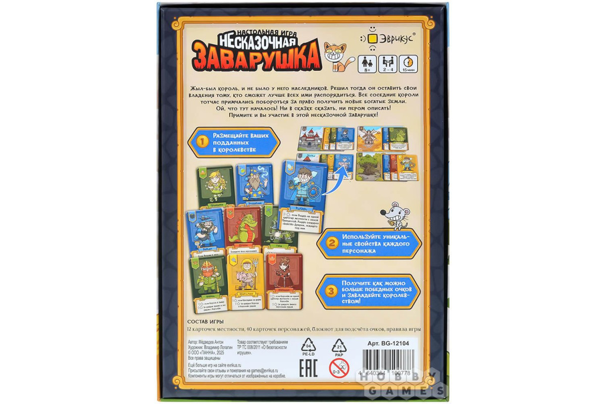 "Несказочная заварушка" – это динамичная карточная игра, где вам предстоит сразиться за право стать новым правителем сказочного королевства. Расставляйте персонажей на картах лесов, замков и деревень, используйте их способности и перехитрите соперников, чтобы собрать как можно больше очков. Простые правила, яркие иллюстрации и непредсказуемые повороты делают каждую партию уникальной. Идеально для тех, кто любит быстрые, но насыщенные игры с элементами стратегии и юмора.