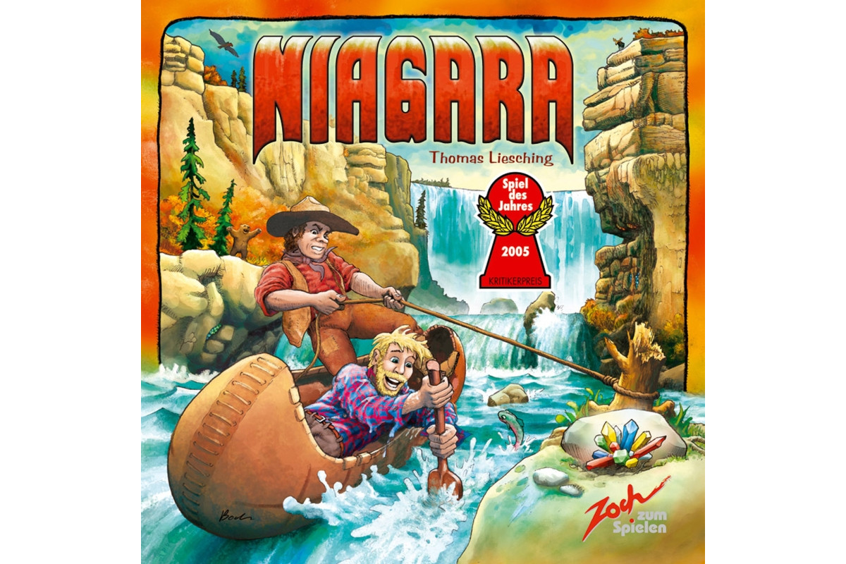 Niagara Niagara is a fantastic treasure hunt in a race against the stream. The canoes of all players drift on transparent disks towards a waterfall. By using their paddle cards, the players navigate the speed of their boats and at the same time, affect the tempo of the river. The object of these manoeuvres is to load up the gemstones which lie along the riverside. But beware of thieves! Only the one who brings his rich capture ashore can win the game. Niagara is a ravishing wild water spectacle for rash adventurers. for 3 to 5 Players, Ages 8 and up
