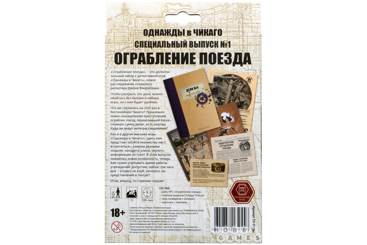 "Ограбление поезда" – это дополнение для настольной игры "Однажды в Чикаго", которое предлагает игрокам разгадать ещё одно запутанное дело.