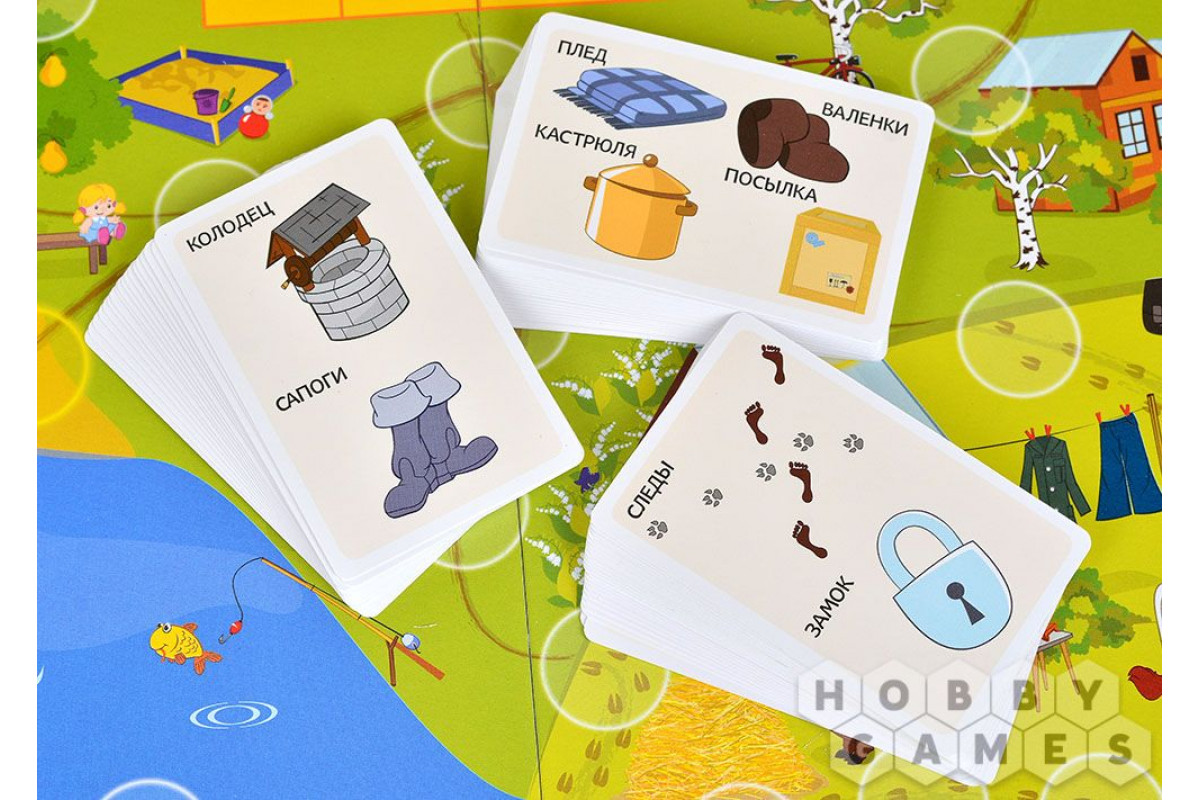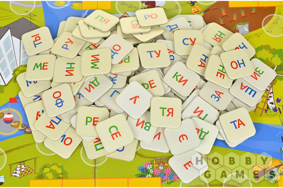 Красный жетон предлагает назвать декоративное растение и вслух определить, сколько слогов в его названии. Это помогает лучше понимать структуру слова и расширяет словарный запас. Синий жетон связан с карточками "Колодец". Вам нужно назвать два предмета с карточки, выделить первые слоги каждого и составить из них новое слово. На зелёном жетоне вы получаете карточку "Дом" с четырьмя словами. Среди них одно отличается по количеству слогов – его и предстоит найти. А с жёлтыми жетонами интереснее всего: они лежат на специальных слоговых схемах. Чтобы выполнить это задание, нужно будет придумать слово со слогом, указанным на схеме. Если слог один – достаточно назвать короткое односложное слово и подсчитать в нём количество букв.