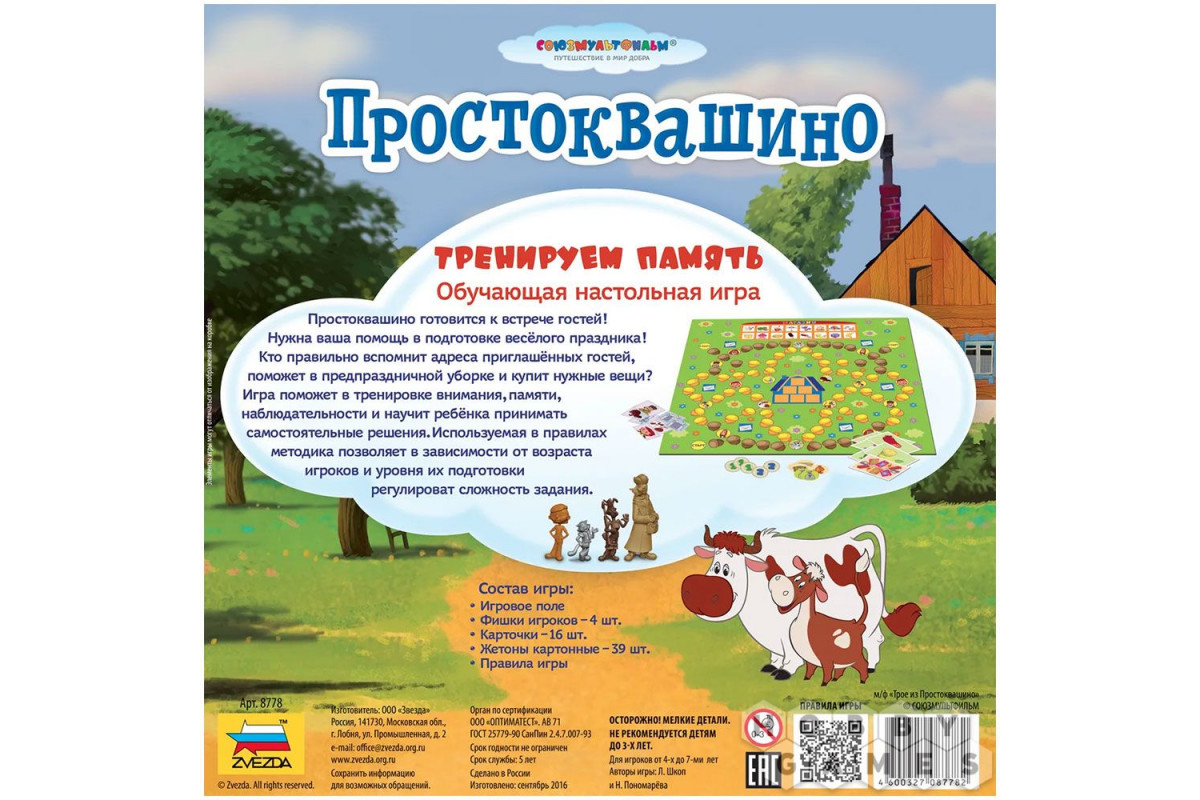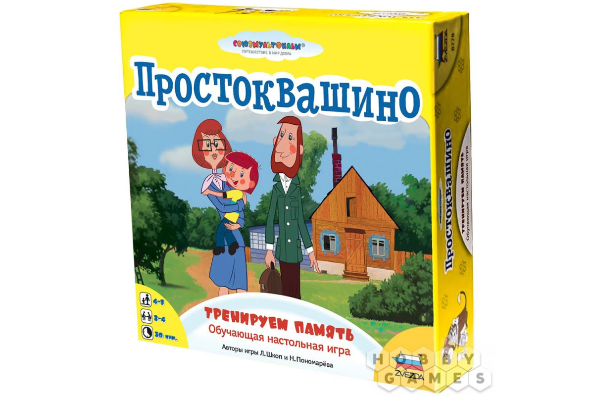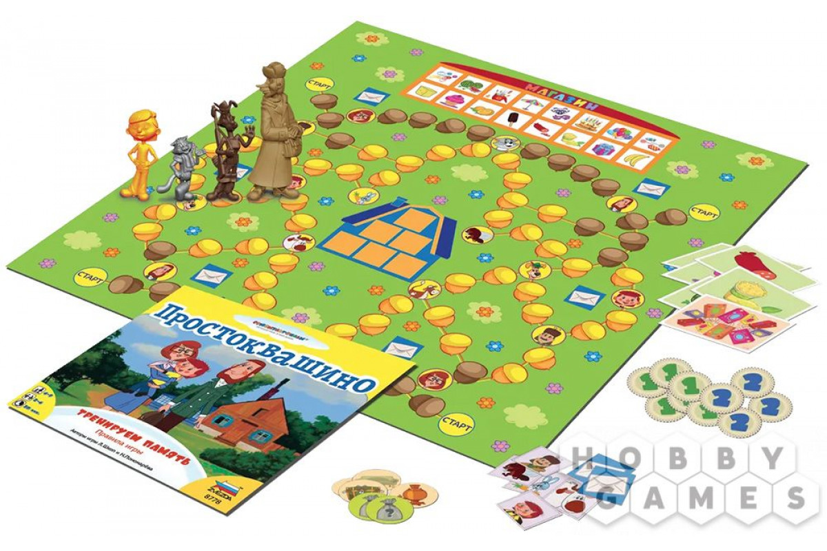 "Простоквашино: Тренируем память" – это развивающая настольная игра, созданная по мотивам любимого мультфильма. Как вы уже, наверное, поняли из названия, она тренирует память, внимание и наблюдательность. Вам предстоит помочь героям подготовиться к празднику – разыскивать нужные письма, запоминать предметы, разносить приглашения и делать покупки. Игра адаптирована под разный уровень подготовки: в неё можно играть как по простым правилам для начинающих, так и по более сложным – для тех, кто уже умеет держать в памяти несколько задач одновременно. Имейте в виду: в качестве ведущего обязательно нужен взрослый, который поможет детям освоить игровой процесс.