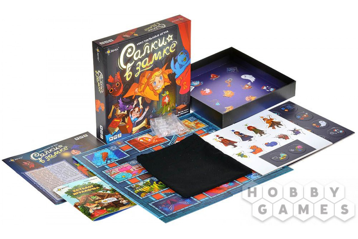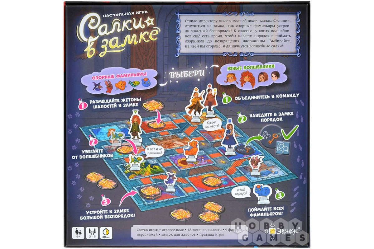 "Салки в замке" – это динамичная игра формата "один против всех", где один игрок управляет проказниками-фамильярами, стремясь разложить по замку жетоны шалостей, а команда волшебников пытается их остановить. Уникальные жетоны "беспорядков" и "происшествий" требуют разных тактик: одни нужно относить в нужные комнаты, для других – собирать вместе определённых волшебников. Красочное поле, фигурки с удобными подставками и интуитивные правила погружают в атмосферу весёлого магического противостояния.