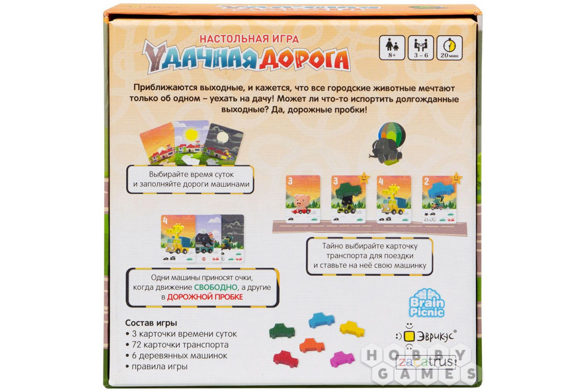 В настольной игре "Удачная дорога" игрокам предстоит доехать до пригорода, а после – вернуться обратно. Причём желательно сделать это, сохранив отличное настроение и собрав по пути как можно больше победных очков. Отправиться в поездку можно утром, днём или ночью. В зависимости от выбранного времени суток будет меняться трафик на дороге, а также количество очков радости, которые, собственно, и являются победными. Путешествуя на протяжении трёх раундов на дачу и обратно в город, участники набирают победные очки. Тот, кто сможет набрать наибольшее количество очков радости, объявляется победителем и самым продуманным додачидобирателем.