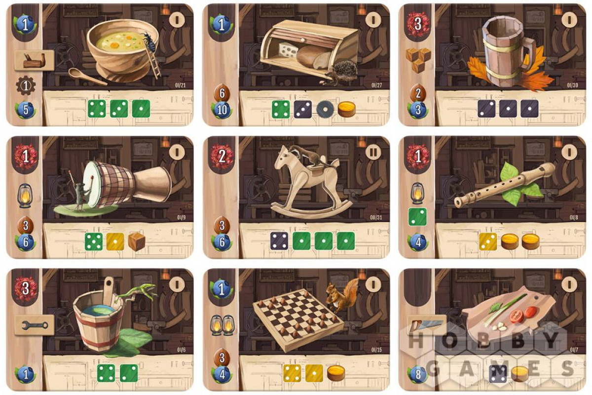 В начале партии каждый игрок готовит свой планшет и, начиная с первого хода, выбирает на колесе действий один из семи доступных вариантов. Но те действия, которые в начале раунда остались без внимания, постепенно становятся ценнее, принося дополнительные бонусы при выборе. Используя их в сочетании с особенностями своей мастерской, вы будете получать и обрабатывать кубики-"древесину" – пилить, склеивать, покупать или даже выращивать их. Комбинируйте кубики и жетоны, чтобы выполнять заказы и зарабатывать очки. Всего пять раундов – и именно сумма набранных очков определит, чья мастерская заслужит звание лучшей!