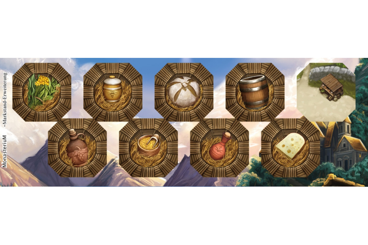 With the mini expansion Monasterium: Market Stall becomes even more varied. The market stall tile is placed on the path. Whenever the market stall is visited or passed, the players can choose a speciality such as some cheese, liqueur or mustard. Each speciality gives the player a special ability that can be used at any time during their turn.