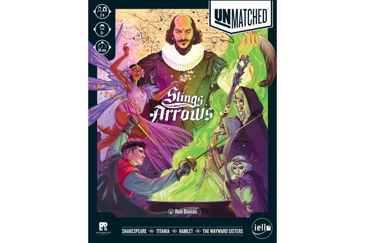 Unmatched Slings and Arrows comes with 4 new heroes related to Shakespeare’s universe. Play as Hamlet or the fairy Titania. You can also play as the 3 Wayward Sisters. In fact, this is the first time you can play as a 3-fold hero in the classic Unmatched sets!