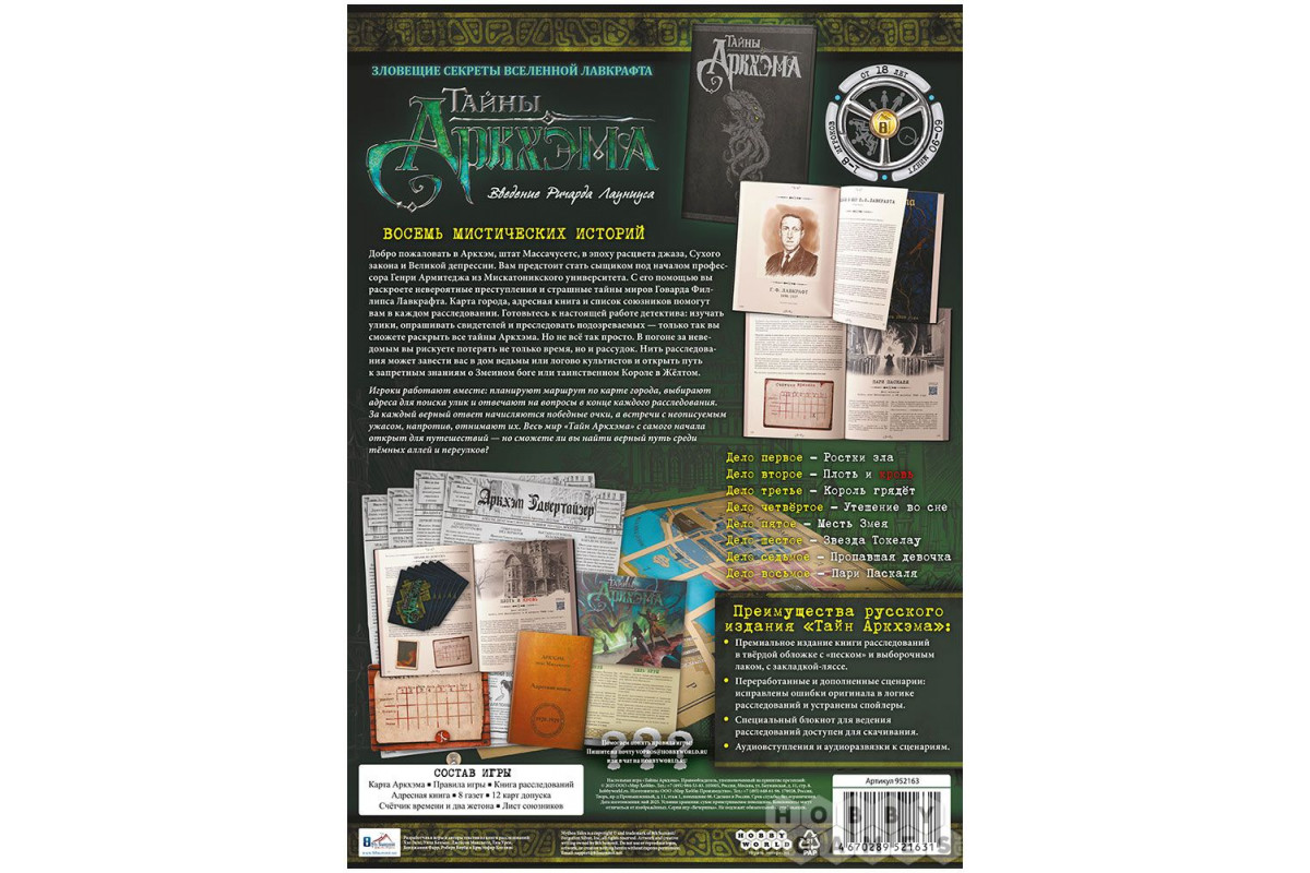 "Тайны Аркхэма" – это приключенческая детективная игра, в которой игроки, объединяя свои способности к детективному ремеслу, расследуют странные события в восьми сценариях (чем дальше, тем сложнее дело). Вы будете вести дела независимо от Армитеджа, а в конце сможете сравнить свои успехи, ответив на ряд вопросов. Чем лучше справится ваша команда, тем выше будет победный счёт!