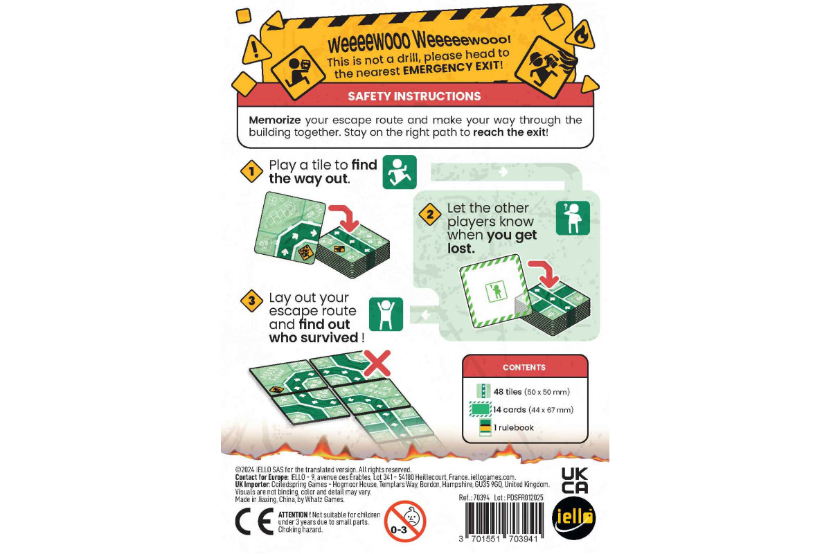 Play your “Lost tile” when you think you’re lost and the path is dead-end. At the end of the round, lay out your escape route and find out who survived to score points! Start a new round and add one more constraint to add even more panic to the table