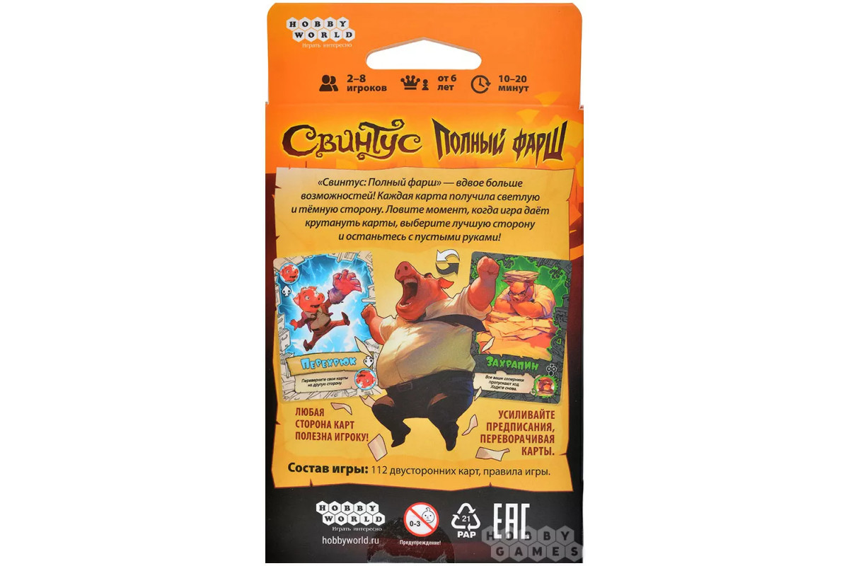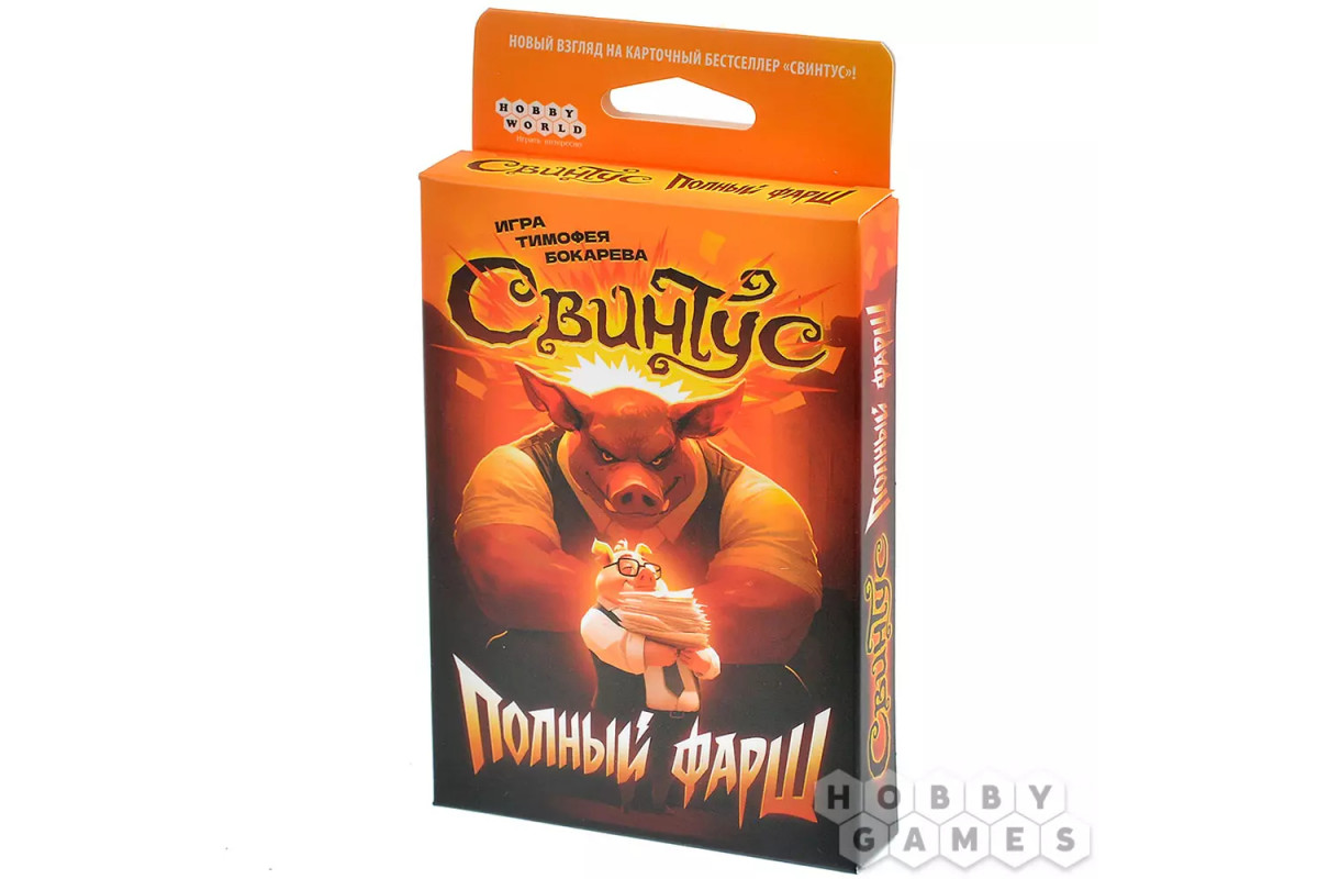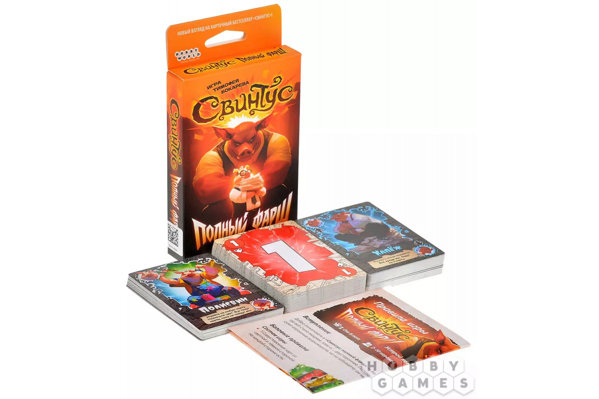 "Свинтус: Полный фарш" сохраняет дух оригинала, но добавляют крутой вираж: нужно быстрее всех избавиться от карт, используя их двойную природу. Ваша стратегия будет заключаться в том, чтобы чувствовать момент, когда переворот карты принесёт максимальный эффект и оставит соперников в растерянности.