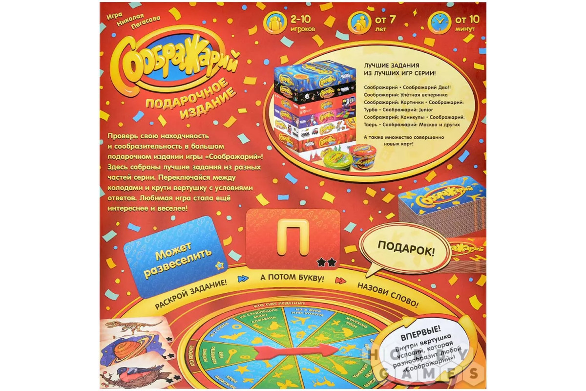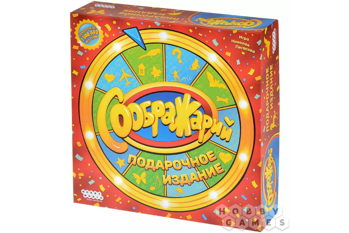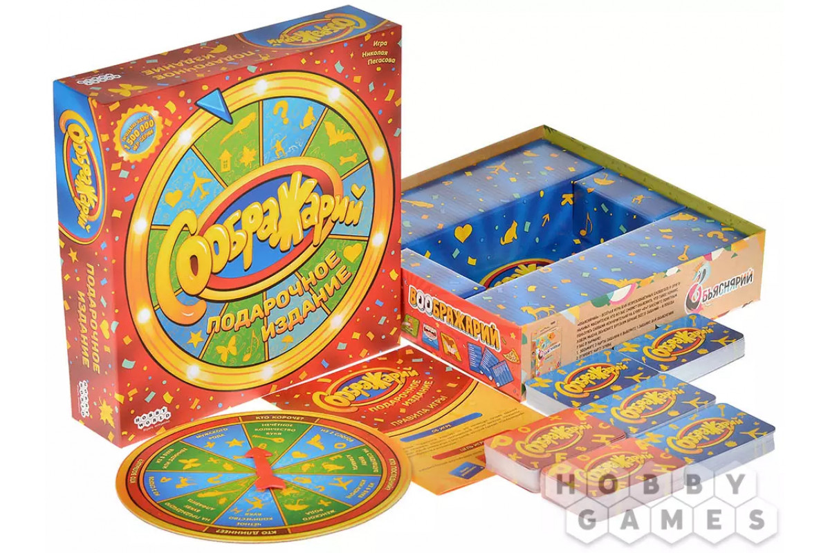 "Соображарий: Подарочное издание" – это коллекция лучших заданий из всей серии культовой игры, собранная в одном наборе. Вы сможете проверить свою находчивость и реакцию в динамичной настолке, где нужно быстрее всех подобрать слово под открытое задание и выпавшую букву.