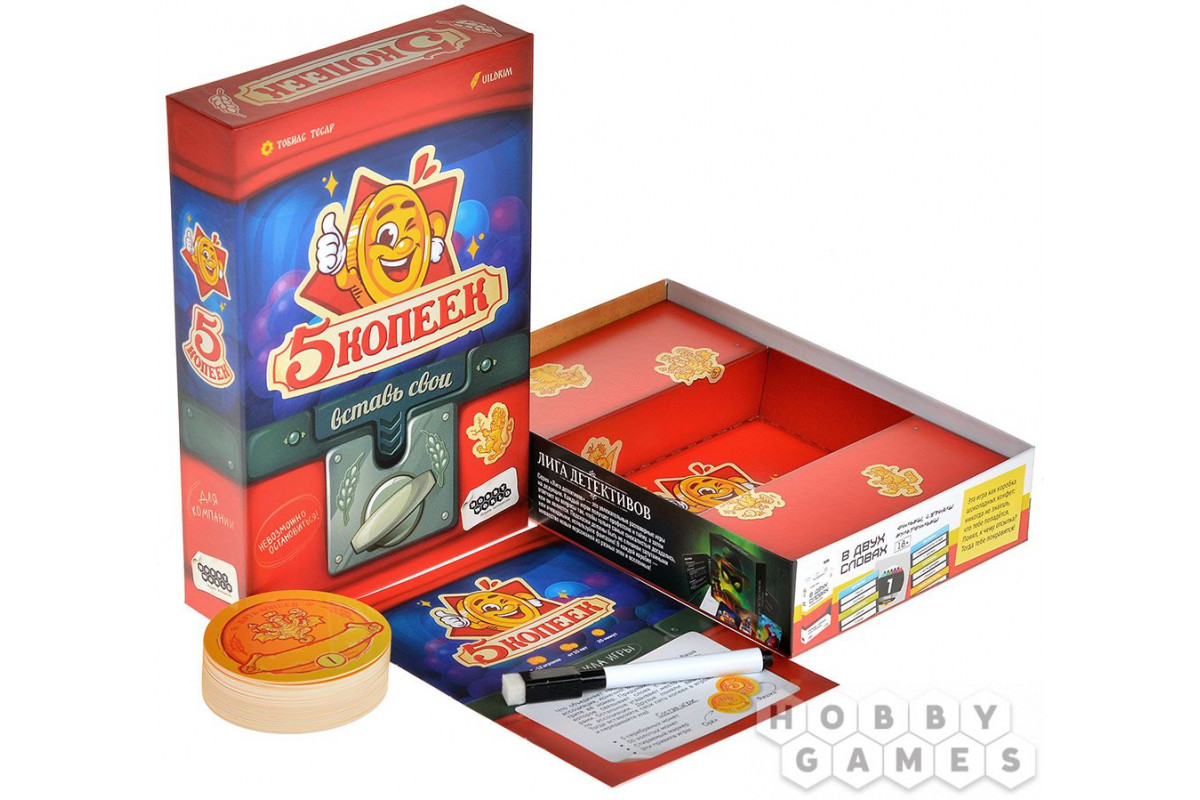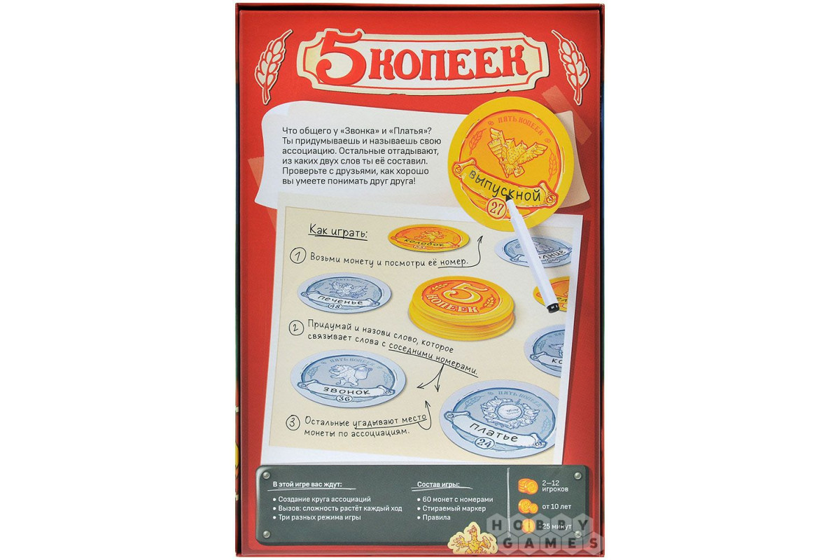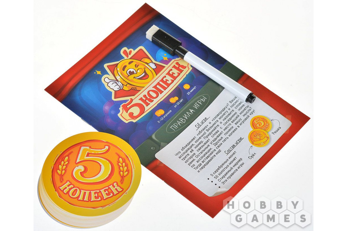 "5 копеек" – это настольная игра для компании от двух до двенадцати человек, где главное – ассоциации и умение читать мысли. В основе лежит простая механика: игрок берёт монету с номером, придумывает слово, связывающее два соседних слова в круге, а остальные пытаются угадать, между какими монетами должна лежать новая. Уникальность игры в её динамике: с каждым ходом круг растёт, а задача становится сложнее. Вы можете играть в классическом режиме, "До первой ошибки", или в командном варианте (от четырёх участников).