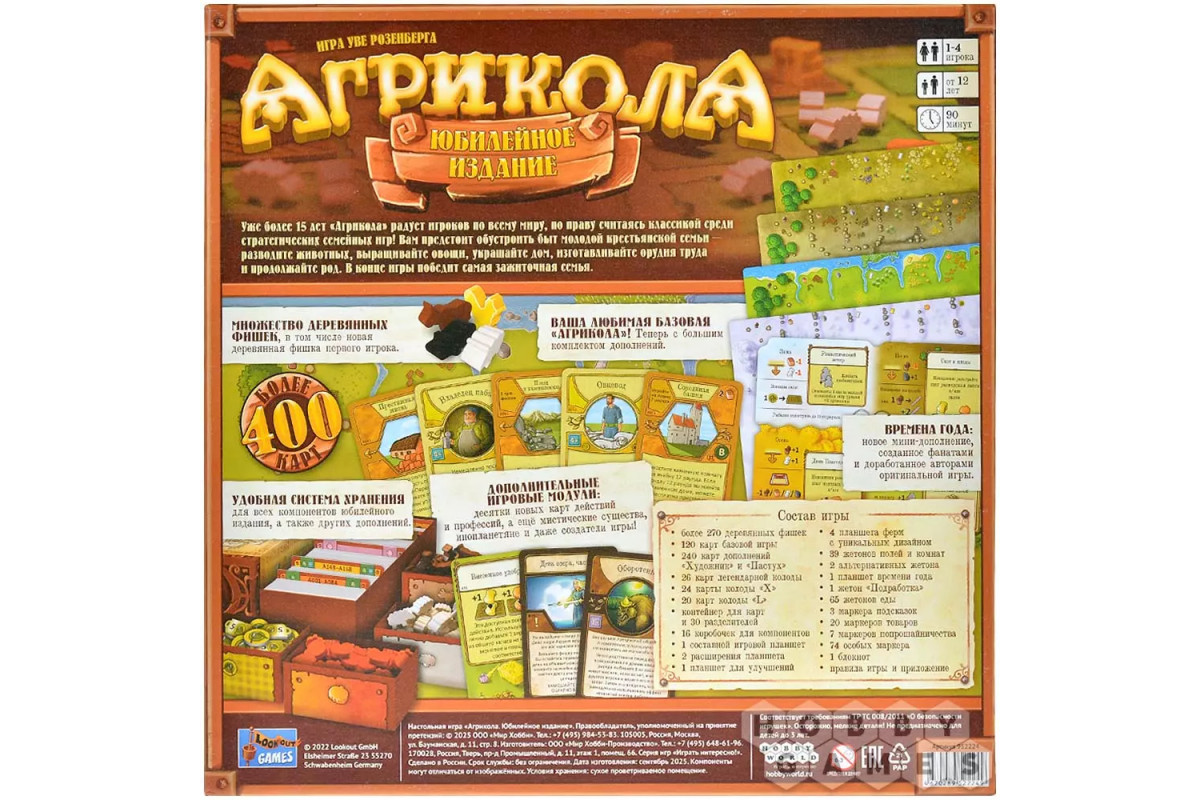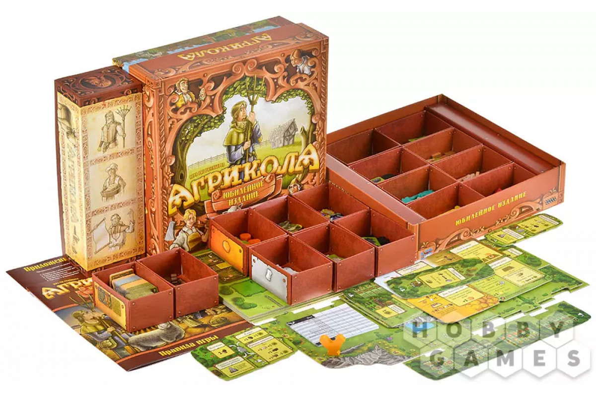 В состав этого издания входит большой комплект дополнений, включая мини-дополнение "Времена года", изначально появившееся благодаря фанатам и затем доработанное авторами оригинальной коробки. Вы найдёте множество деревянных фишек, десятки новых карт профессий и действий, а также дополнительные игровые модули с мистическими существами и даже создателями игры! Всё это организовано в продуманную систему хранения, которая вместит как компоненты этого набора, так и будущие дополнения. Это – самое полное и богатое издание "Агриколы", которое подарит вам сотни часов новых открытий и стратегических решений.