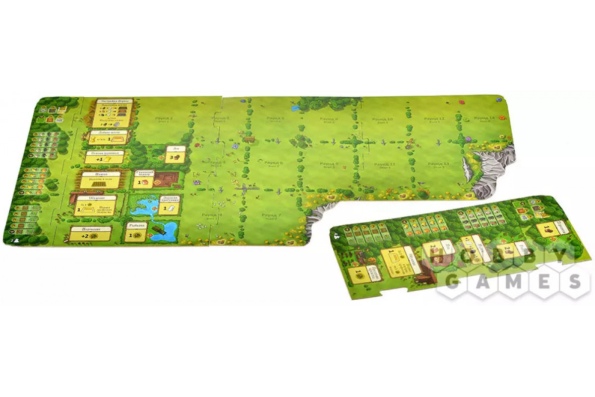 В некоторых раундах затем наступает дополнительный – особенная, тревожно-радостная часть игры. Сначала вы собираете по одной фишке посевного материала с каждого засеянного поля. Затем кормите семью; если еды не хватает, приходится брать жетоны попрошайничества. Завершает эту фазу разведение животных: имея хотя бы двух животных одного вида и свободное место, вы получаете одно новое. Урожай случается не в каждом раунде, но он всегда становится проверкой того, насколько мудро вы управляете хозяйством.