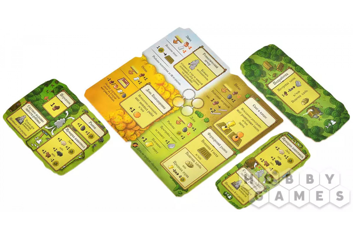 Далее наступает – ваш главный этап. По очереди вы выставляете своих родичей на свободные ячейки действий, немедленно выполняя выбранное действие. Это может быть сбор ресурсов, постройка комнат, вспашка полей, разыгрывание улучшений и профессий и так далее. Если ячейка уже занята, воспользоваться ею нельзя, поэтому каждое решение требует продуманности. Некоторые действия дают сразу несколько эффектов, другие требуют последовательного выполнения, но все они приближают вашу ферму к процветанию.
