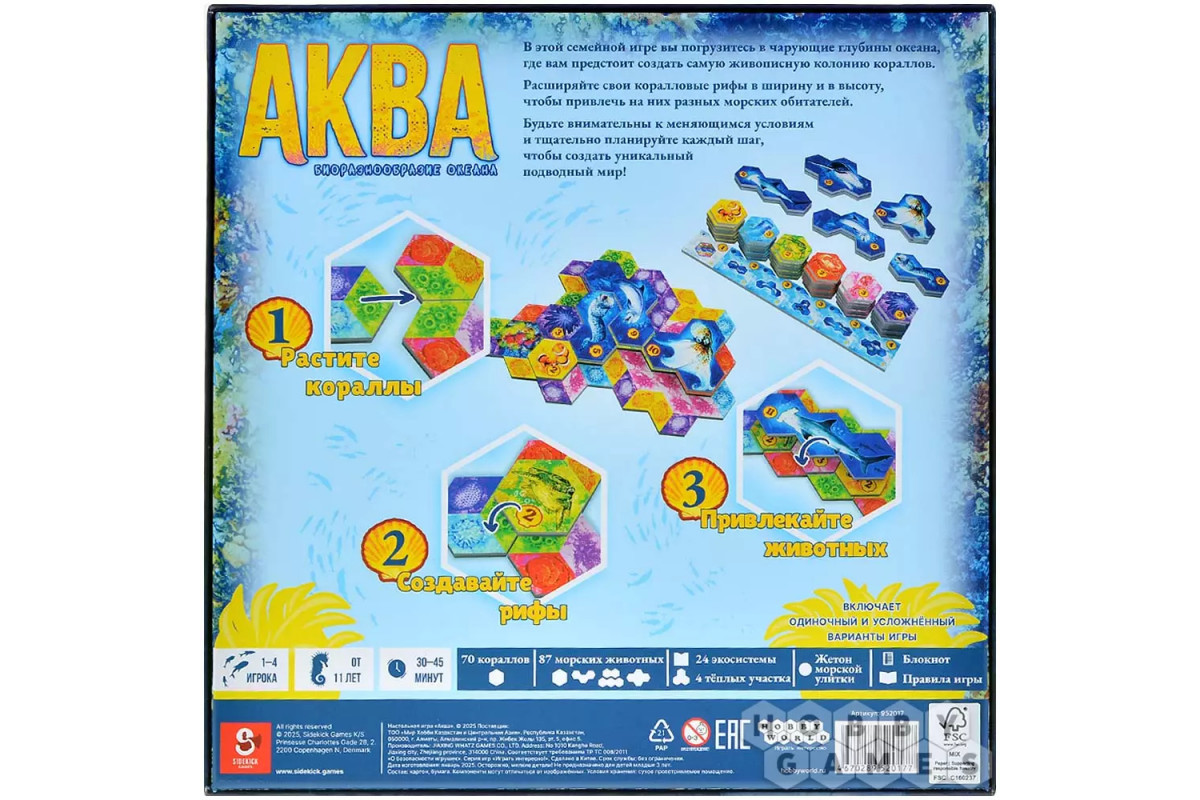 Это тактическая настолка о создании самой богатой и разнообразной коралловой колонии. Вы будете собирать из разноцветных жетонов коралловые рифы, привлекать очаровательных маленьких морских обитателей и создавать условия для появления величественных гигантов океана! Простые, но глубокие правила, потрясающие иллюстрации и успокаивающая морская тематика делают "Акву" идеальным выбором для семейного вечера и встреч с друзьями. Модульные поля, различные сценарии экосистем и несколько уровней сложности обеспечивают высокую реиграбельность, а тактическая глубина позволит каждому игроку разработать свою уникальную стратегию процветания подводного мира.