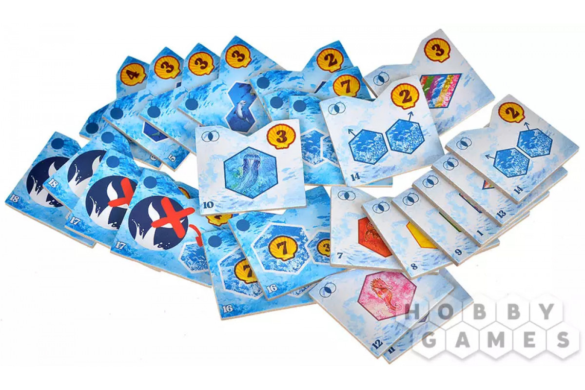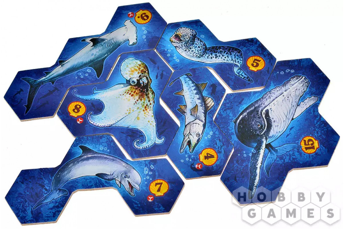 - Обеспечить биоразнообразие – после размещения маленьких животных вы можете привлечь большое морское животное. Для этого разместите его жетон поверх нескольких маленьких животных, соблюдая ключевое правило: все накрытые маленькие животные должны быть разными видами. Большое животное должно полностью покрывать выбранных маленьких обитателей