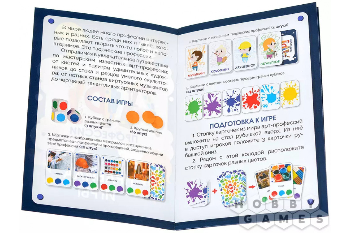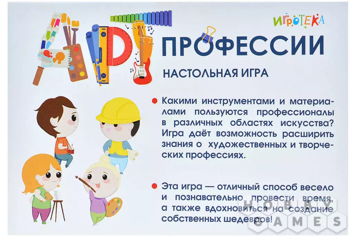 "АРТ-профессии" – это увлекательный способ провести время с пользой, узнать много нового о мире искусства и, возможно, найти вдохновение для создания собственных шедевров. А цель предельно проста: нужно первым собрать пять карточек, на которых изображены инструменты, материалы, предметы или готовые произведения, относящиеся к одной из творческих специальностей. Кто быстрее соберёт полную коллекцию – тот и победил!