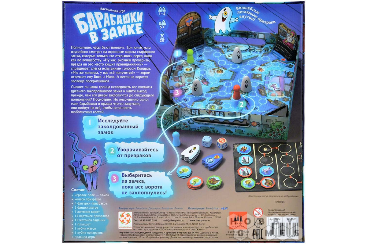 "Барабашки в замке" – это захватывающая кооперативная игра, где вам предстоит помочь трём чародеям выбраться из заколдованного замка, полного коварных призраков. Каждый маг должен выполнить пять заданий, собирая жетоны с волшебными предметами, и успеть покинуть замок до того, как все ворота захлопнутся. Уникальная механика игры включает в себя передвижение юных искателей приключений, вращение колеса призраков и случайные события, которые могут как помочь, так и усложнить вашу задачу. Яркое игровое поле, детализированные фигурки и атмосферные иллюстрации погружают в мир таинственного приключения. А если стандартный режим покажется вам слишком простым, к вашим услугам экспертная сложность с четырьмя барабашками!