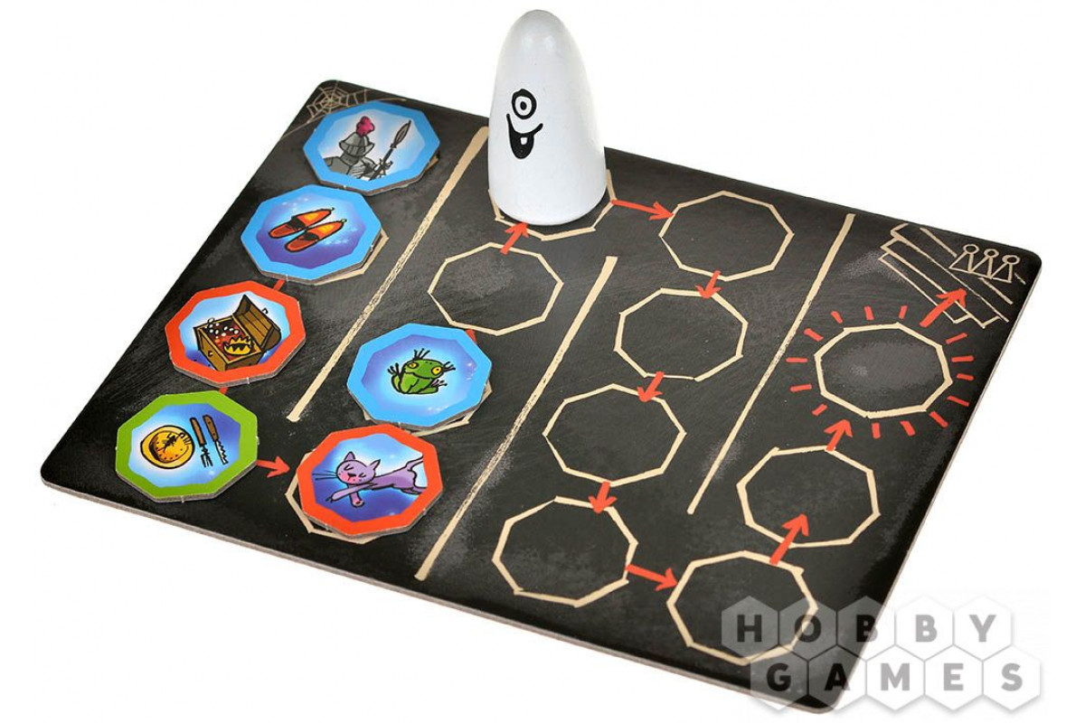 В свой ход бросайте два кубика: голубой определяет, на сколько клеток можно передвинуть мага, а кубик призраков заставляет колесо вращаться, перемещая духов по замку. Осторожно планируйте маршруты – маги не могут проходить сквозь призраков, а случайное столкновение грозит закрытием ворот! Выполняйте задания, открывая новые жетоны, и помогайте друг другу, ведь победа зависит от слаженных действий всей команды. Будьте готовы к неожиданностям: карточки призраков могут как спасти ваших героев, так и ускорить их пленение.